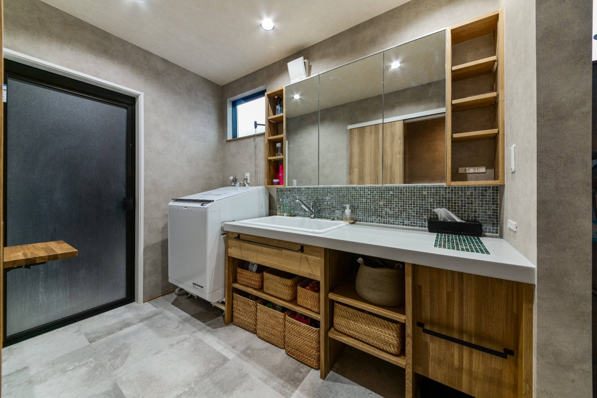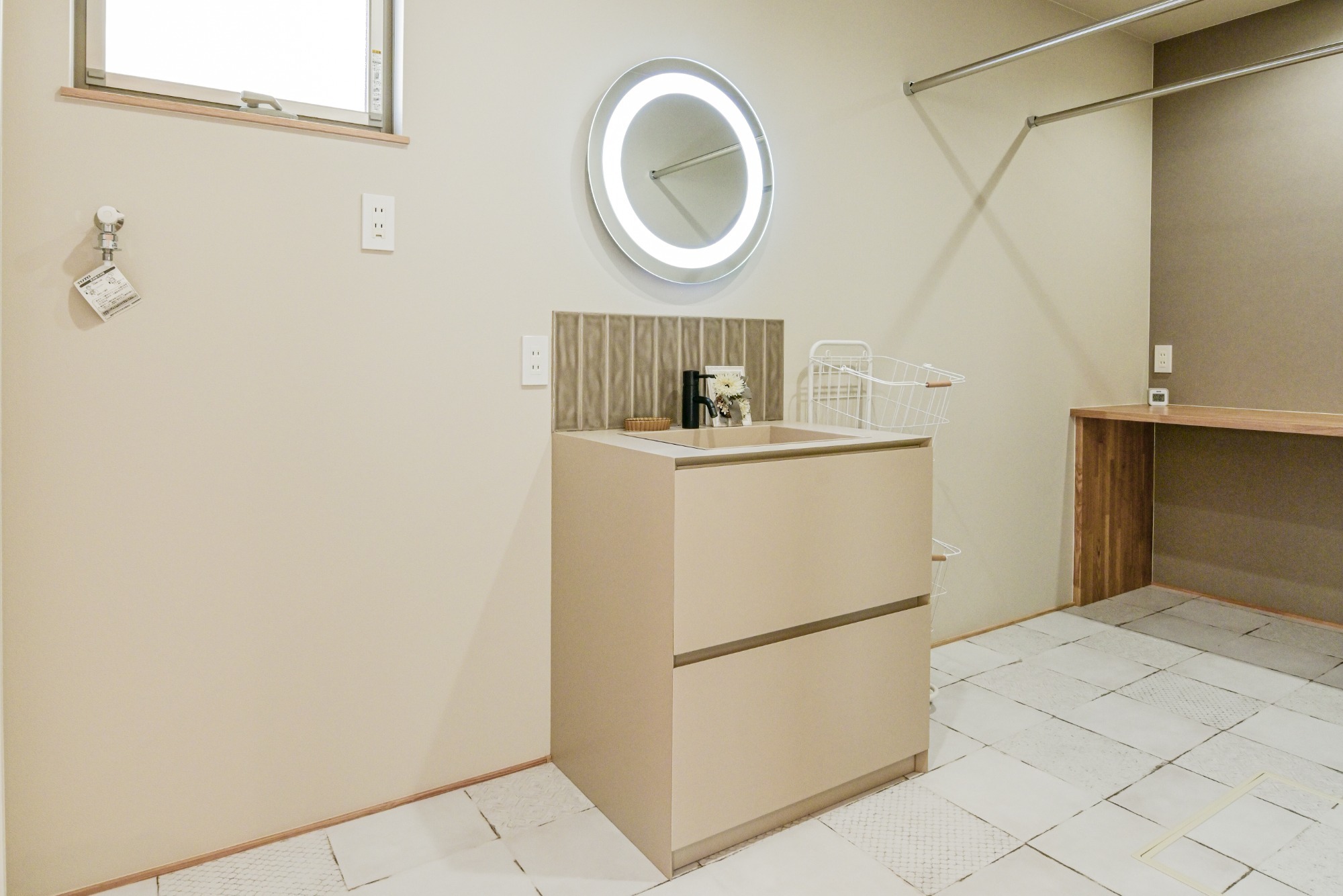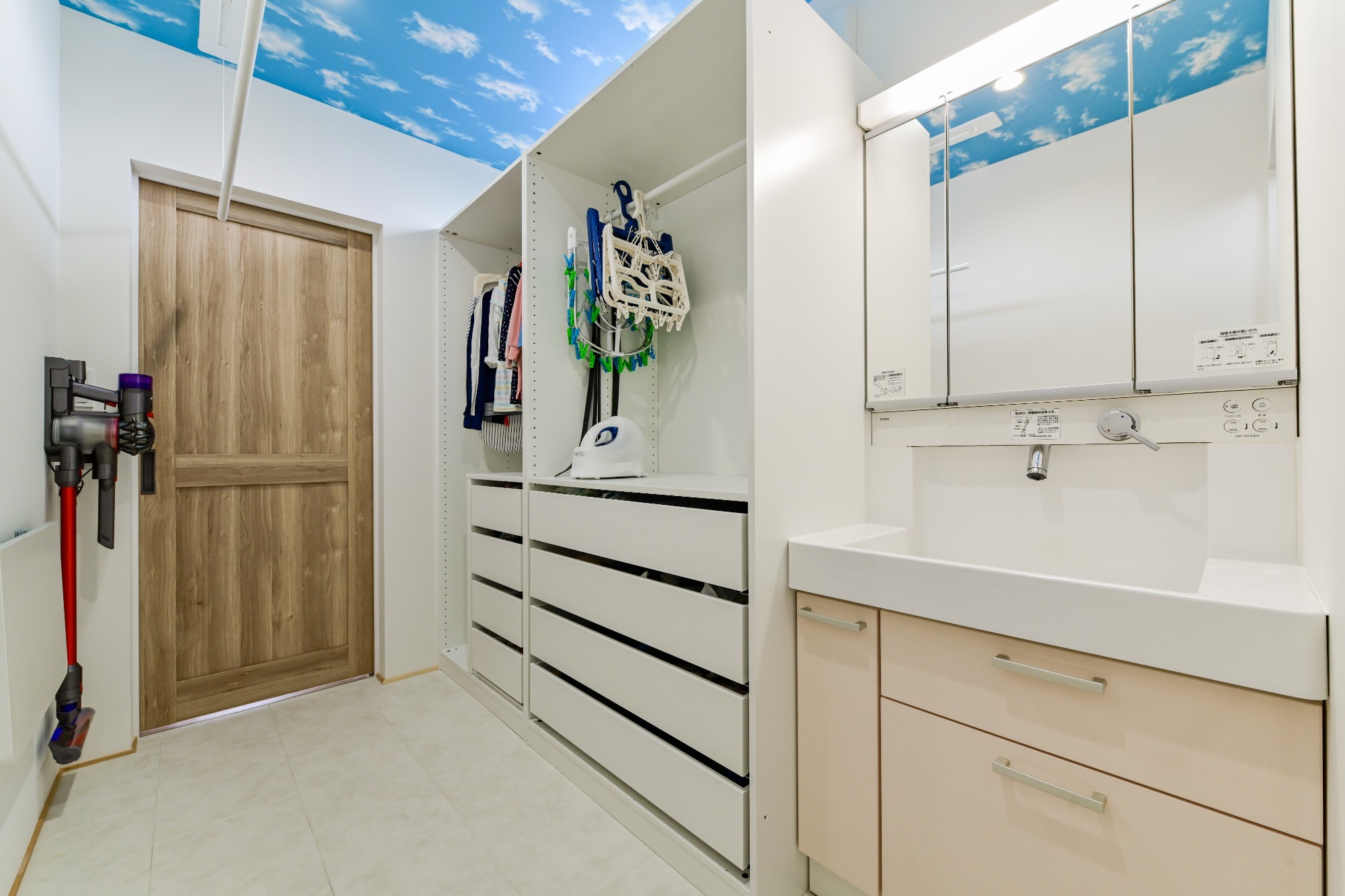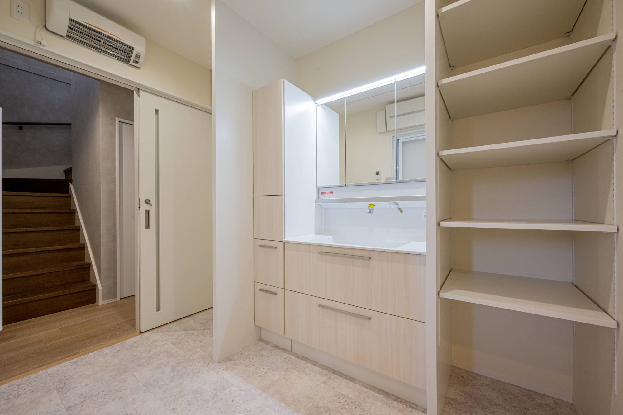シンプルて使いやすいシステム洗面と造作収納のコラボ