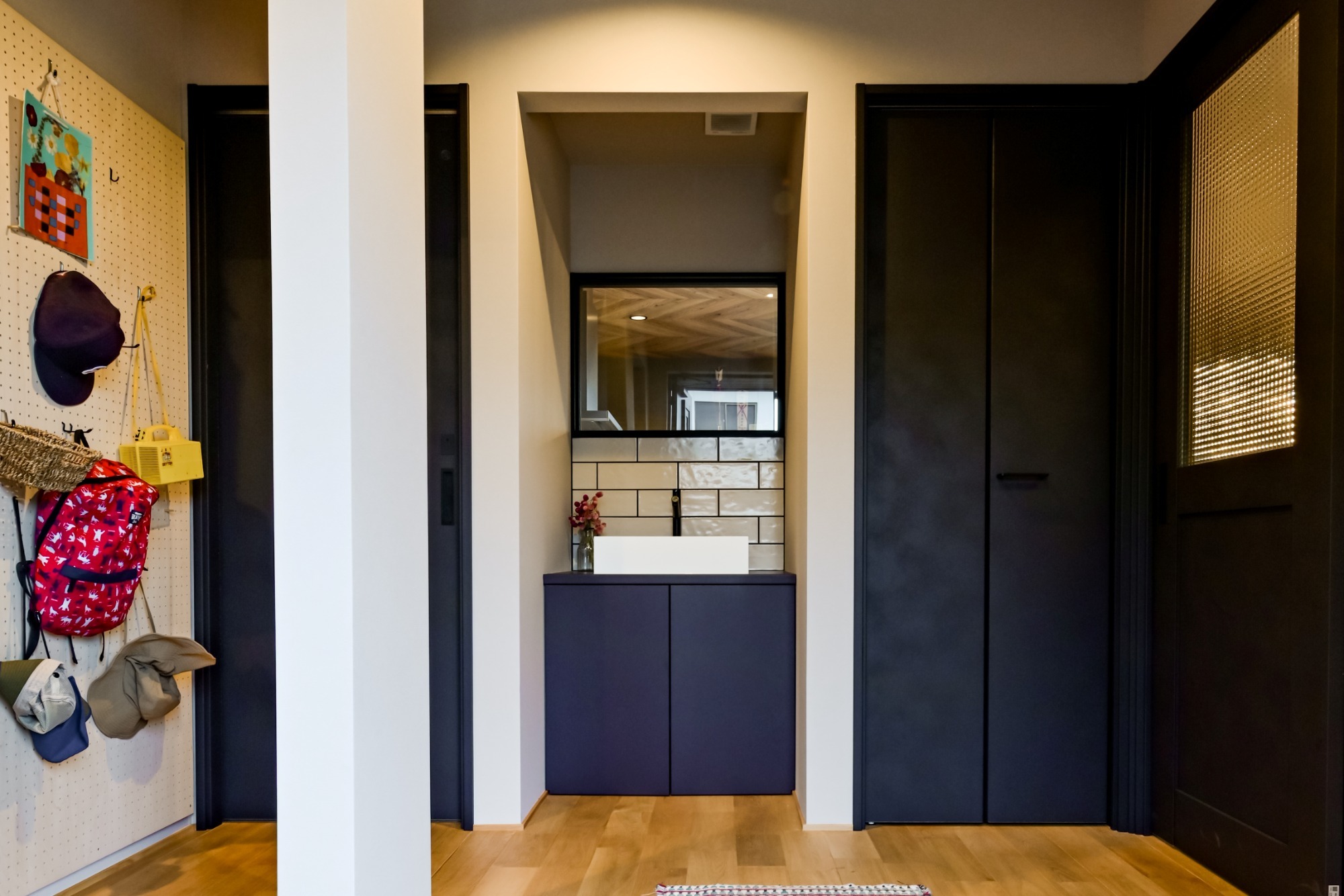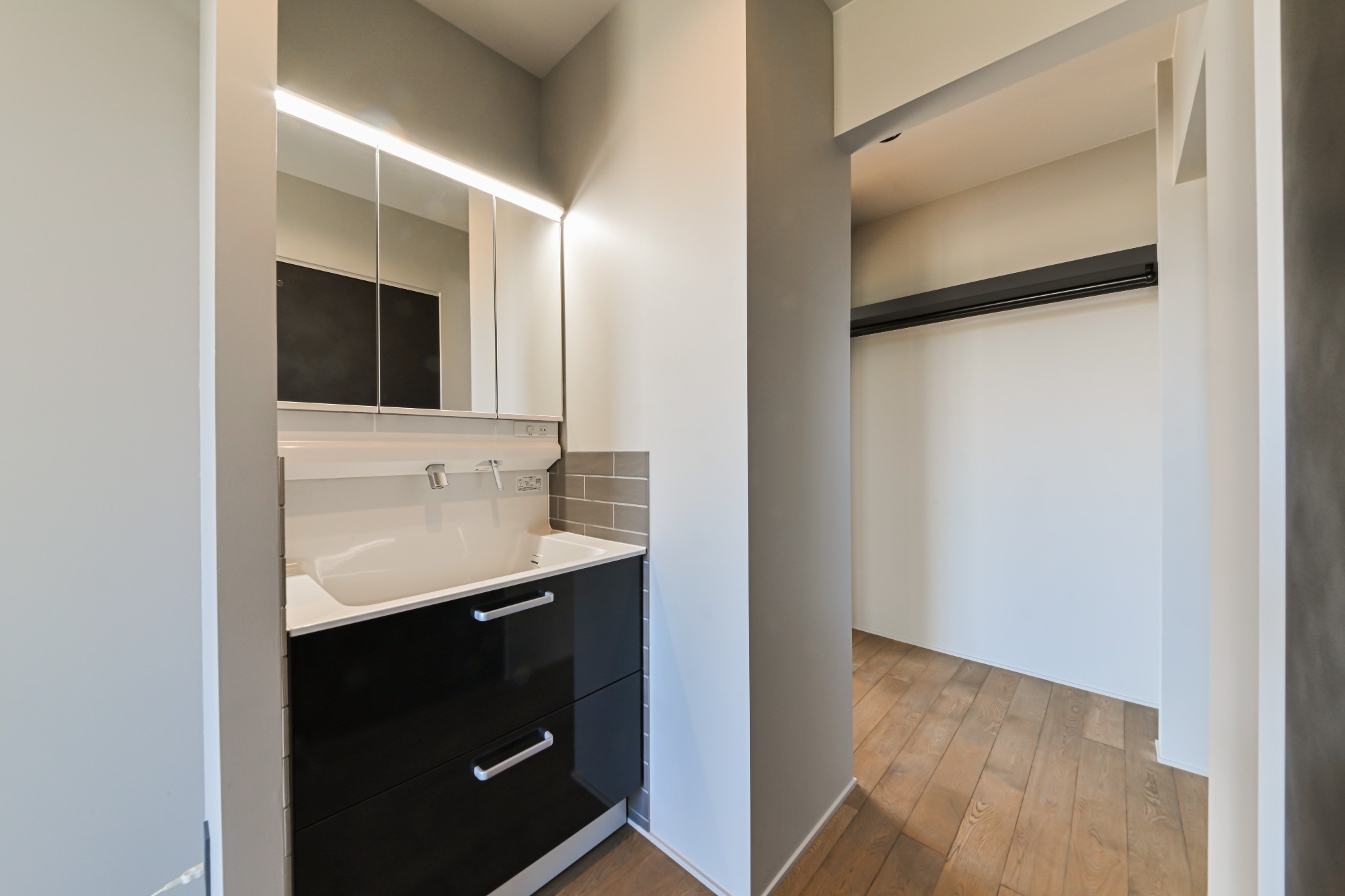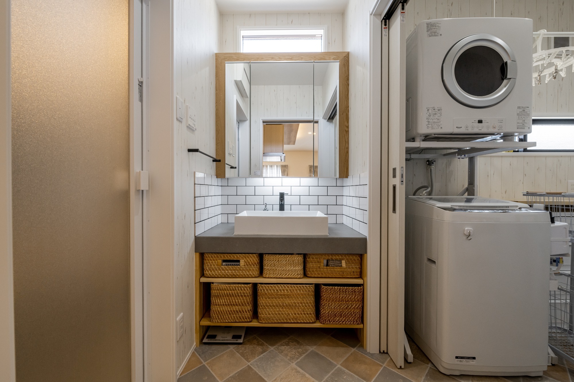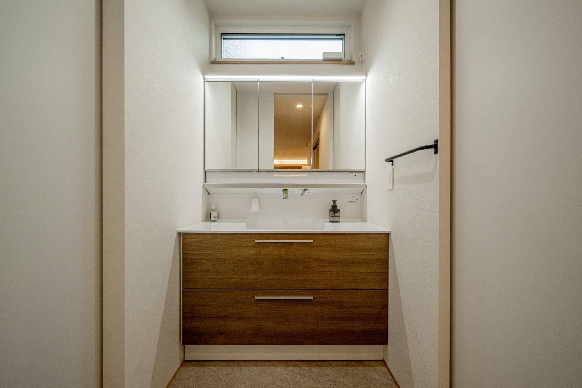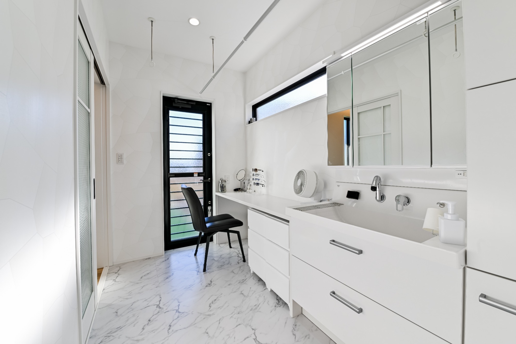 シンプルて使いやすいシステム洗面と造作収納のコラボ