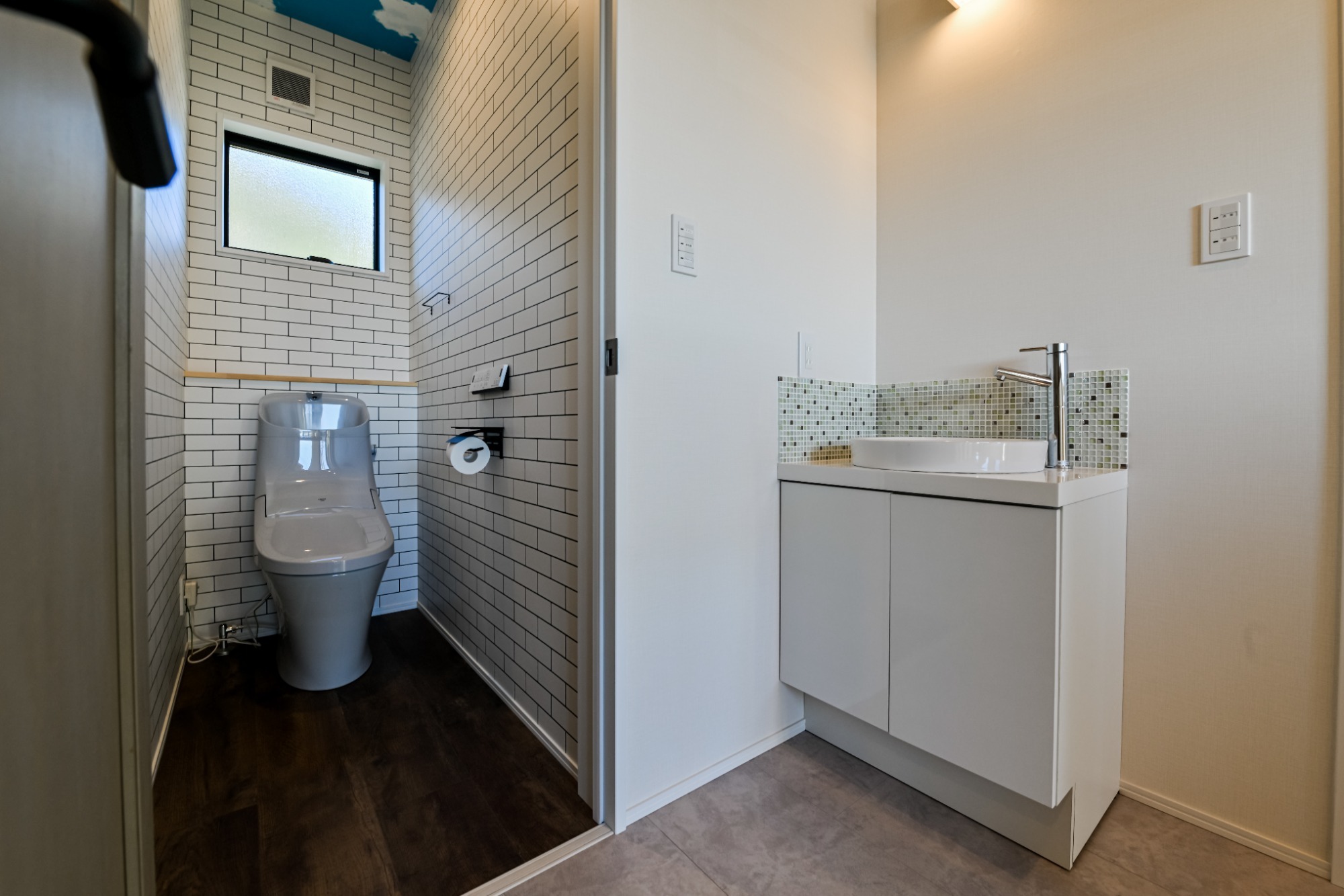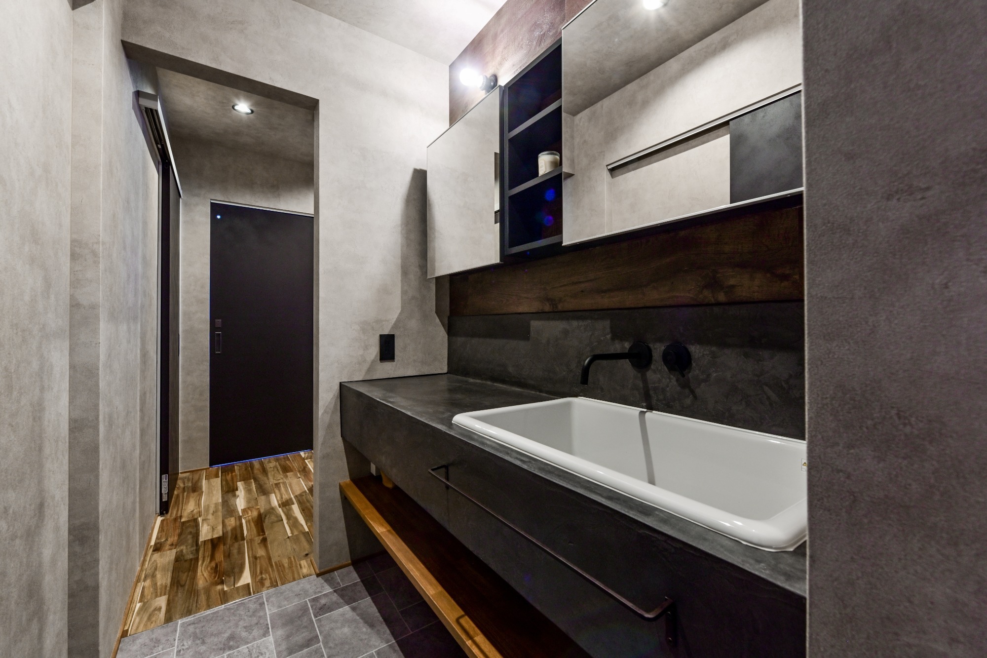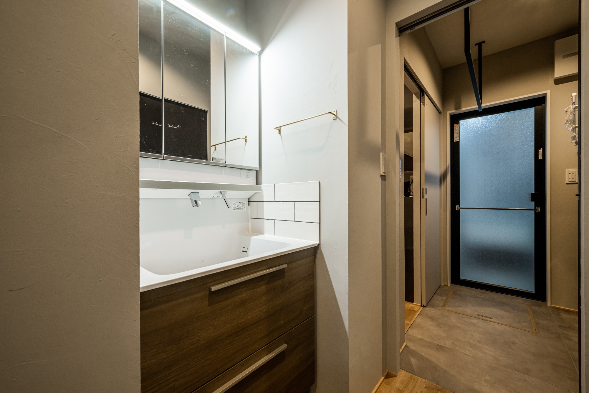 アイカ面材を同柄で仕上げた一体感のある手洗いスペース