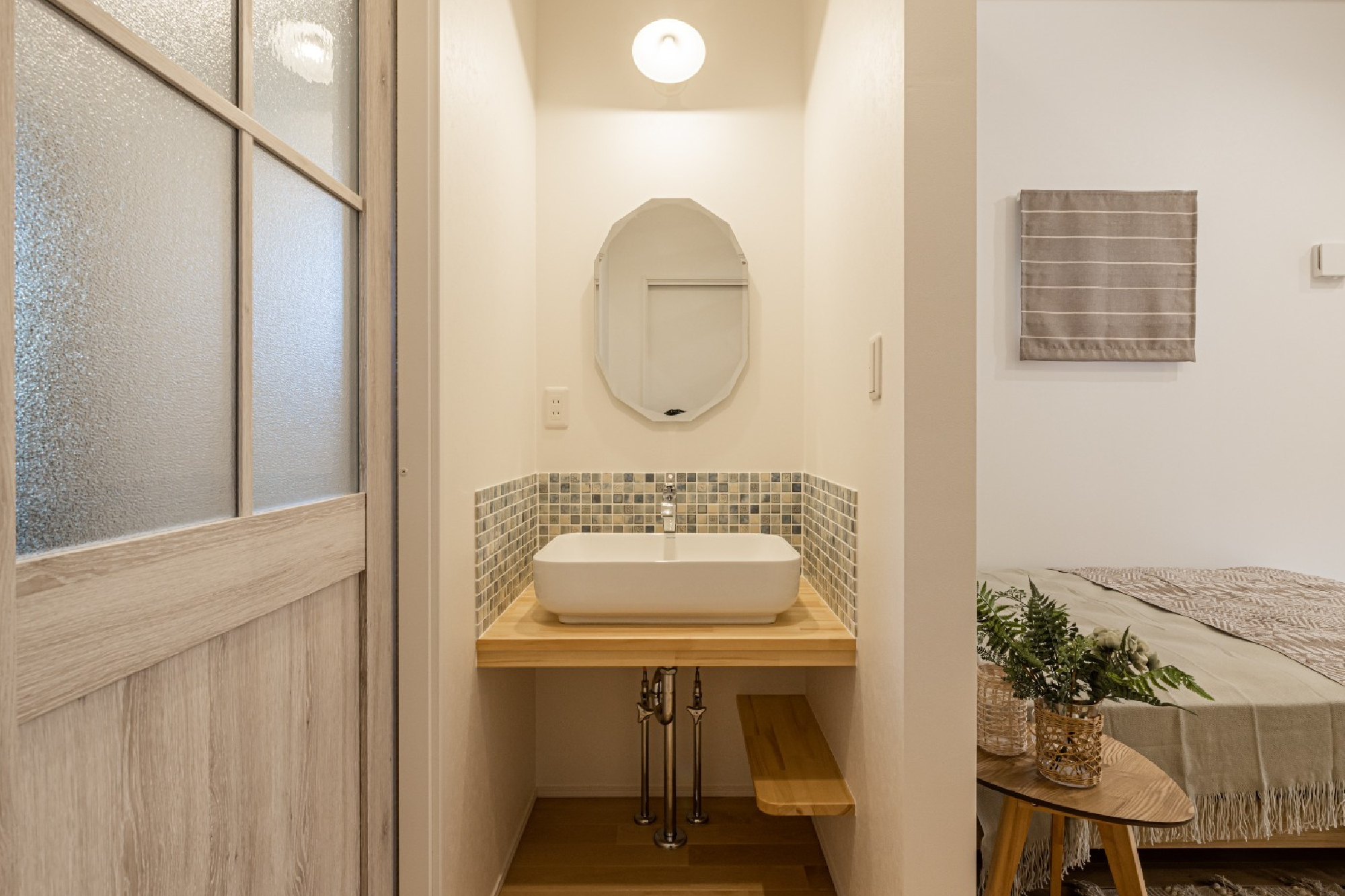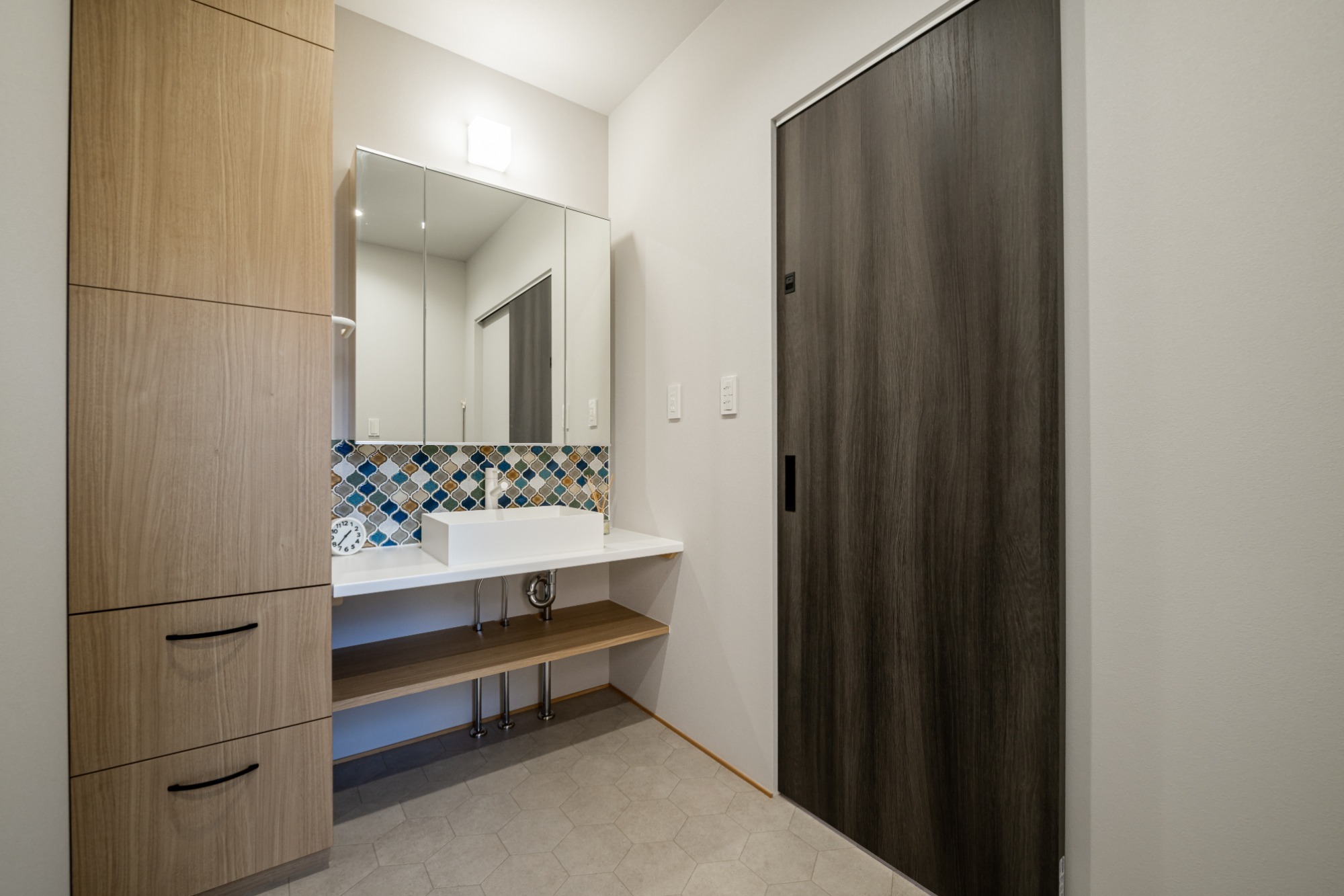 たっぷり収納&こだわりのタイルを貼った造作洗面
