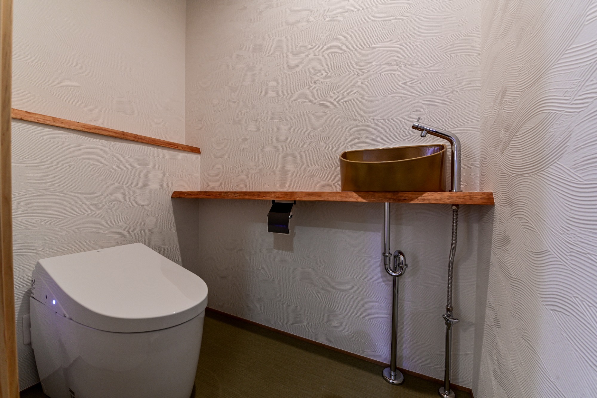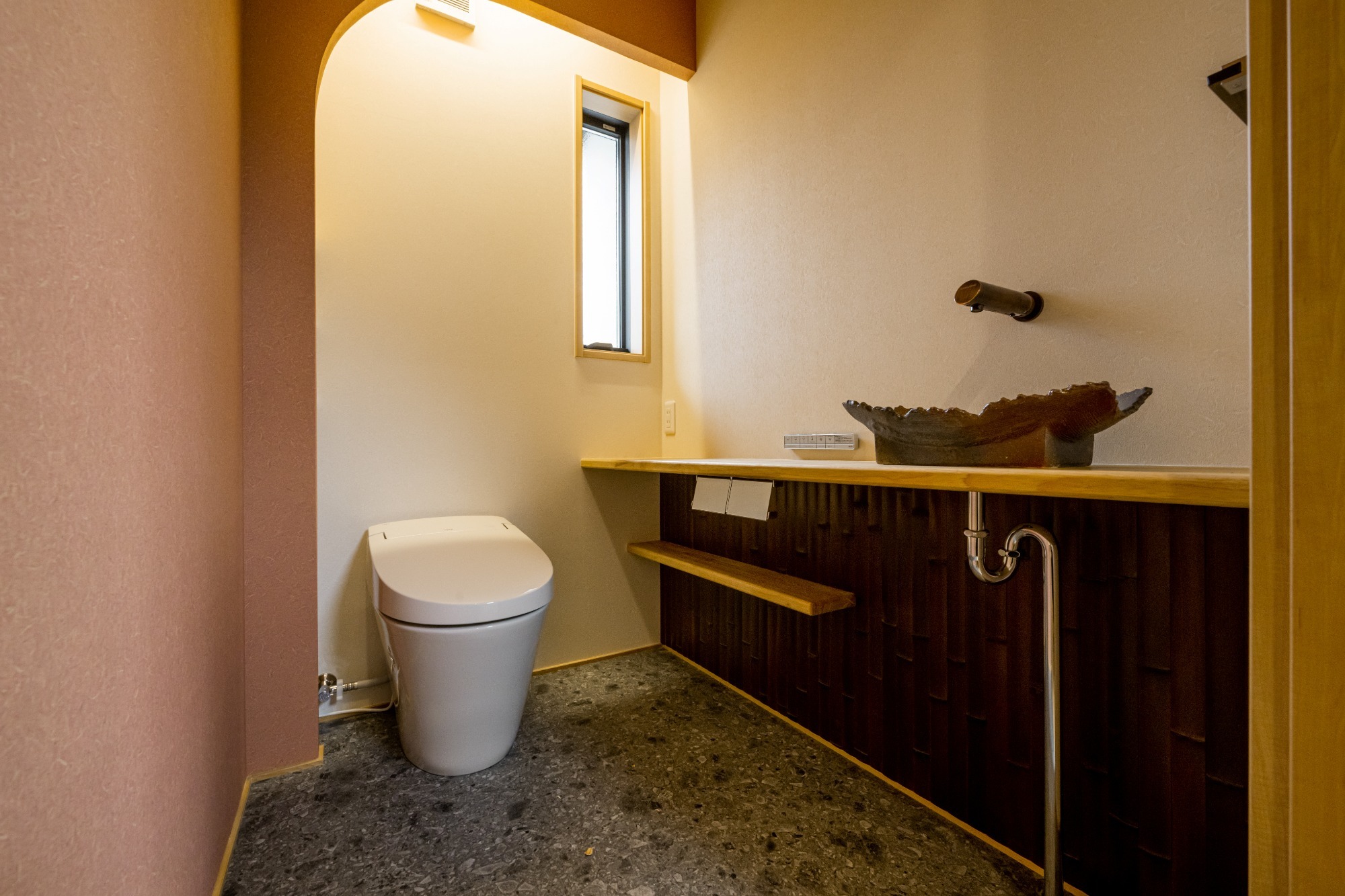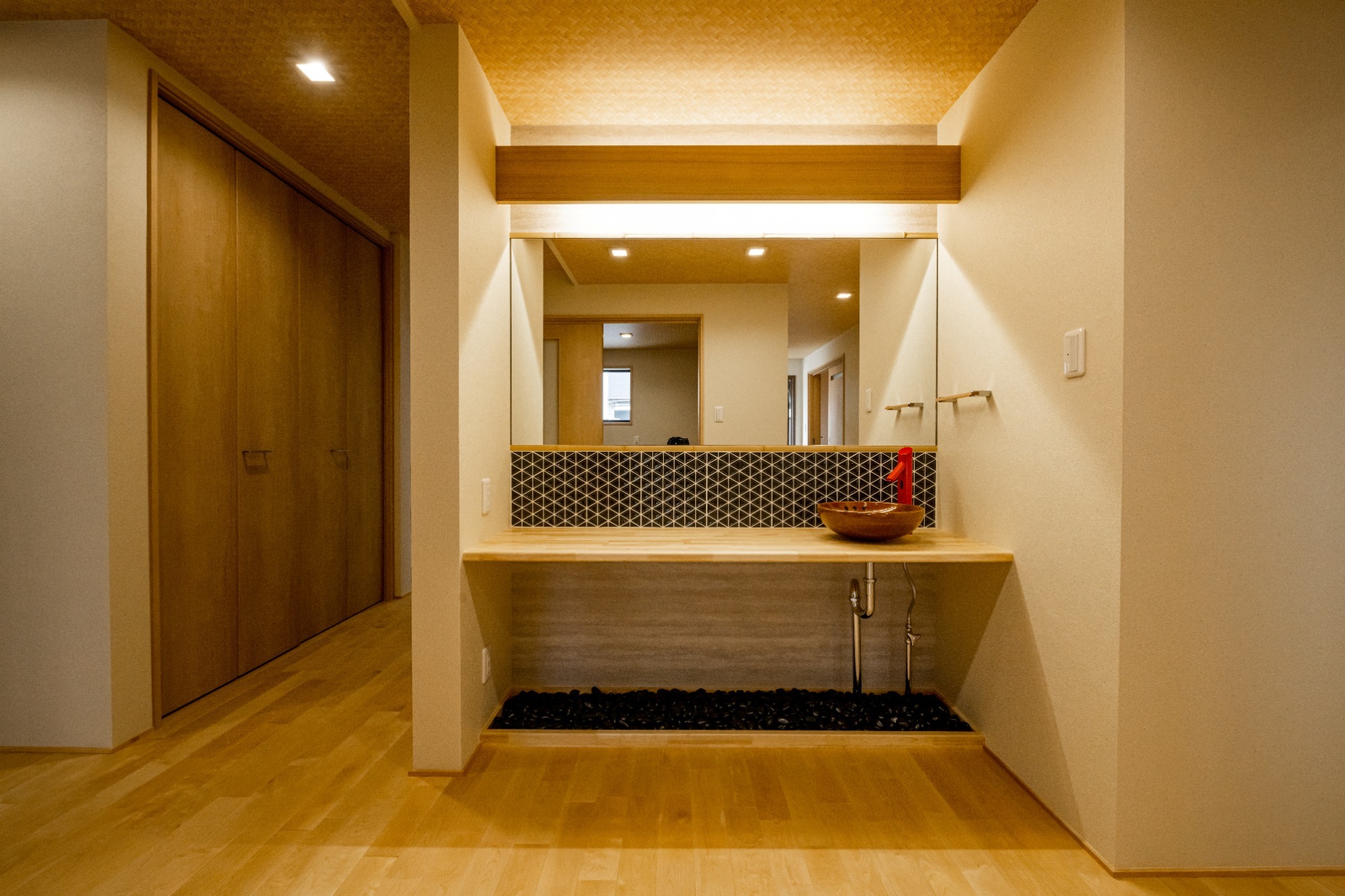 R壁をアクセントにしてカウンター下には竹材を施した和風手洗い