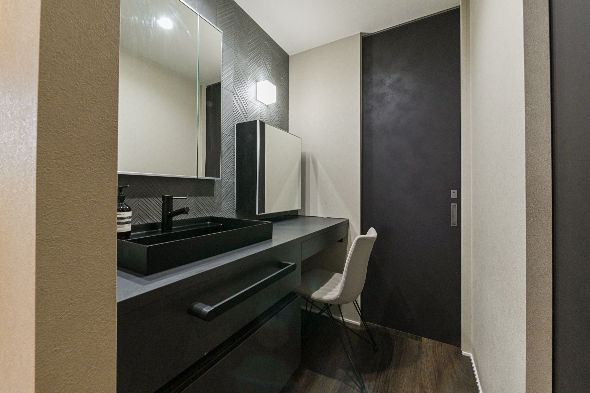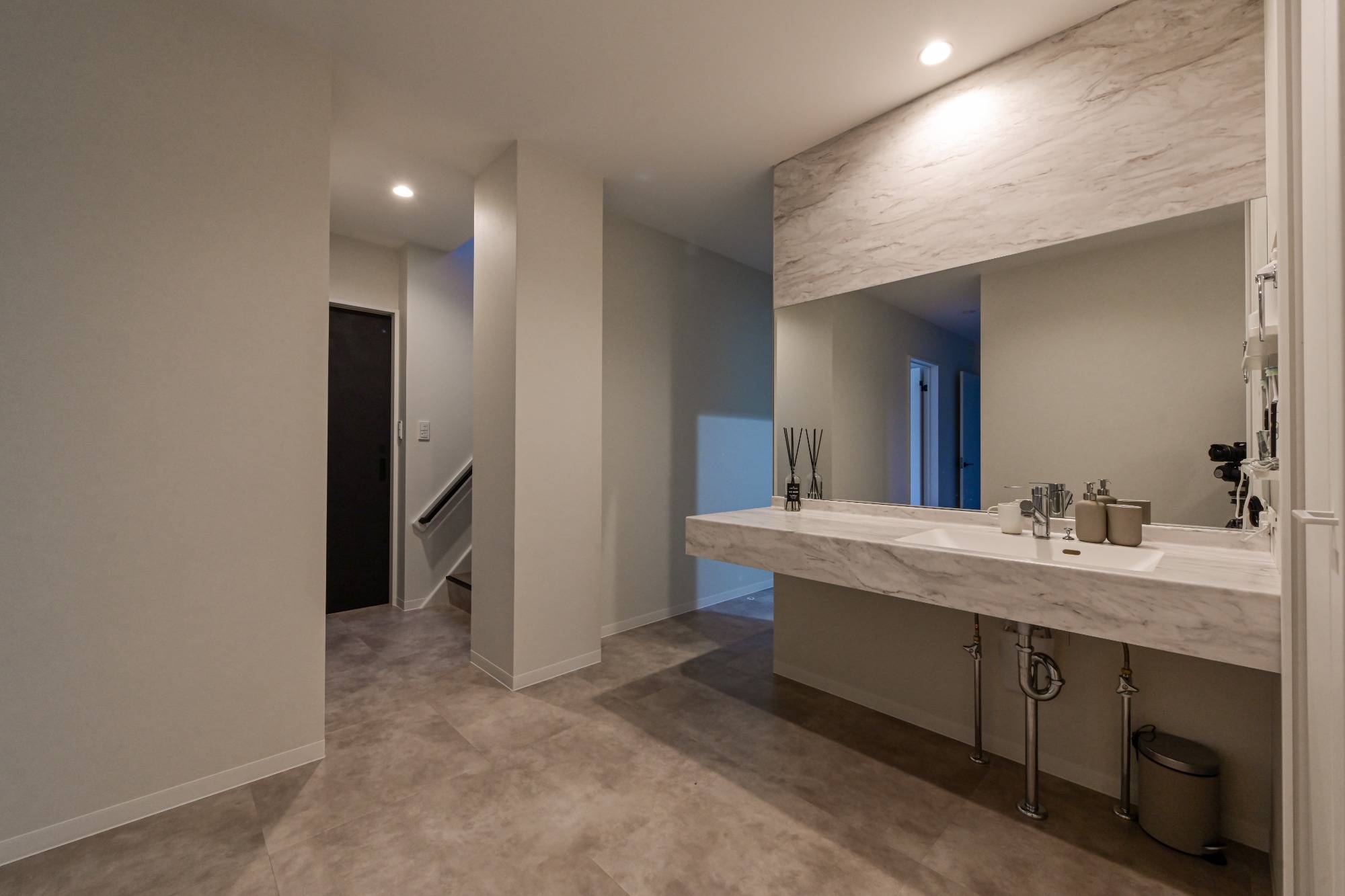 壁面にもカウンターと同じ柄を施工た一体化のあるホテル仕様の洗面