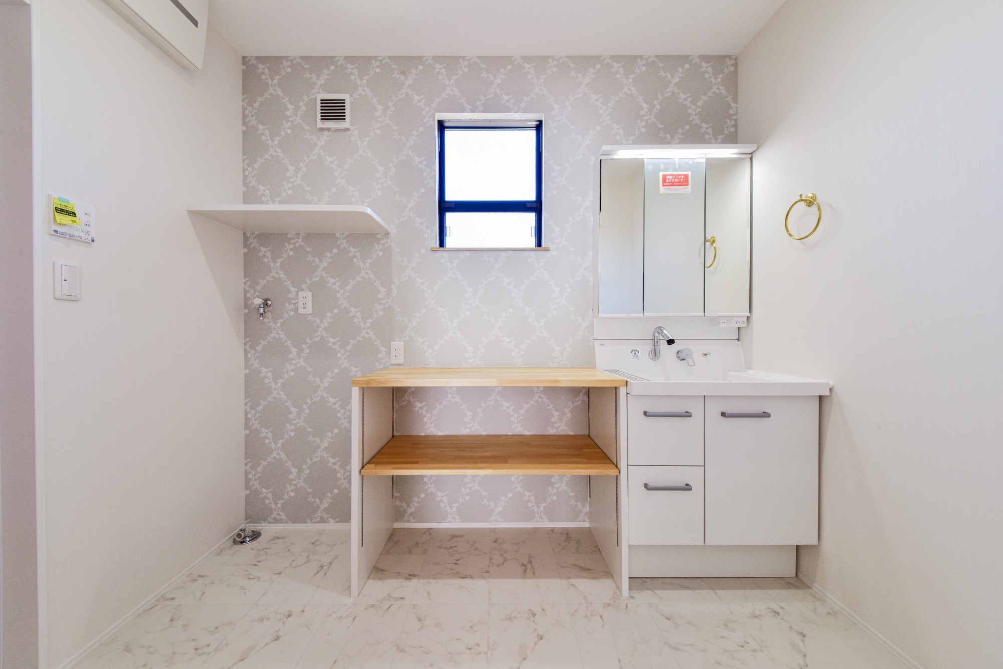 システム洗面とお化粧に洗濯物の作業スペースになる造作カウンター