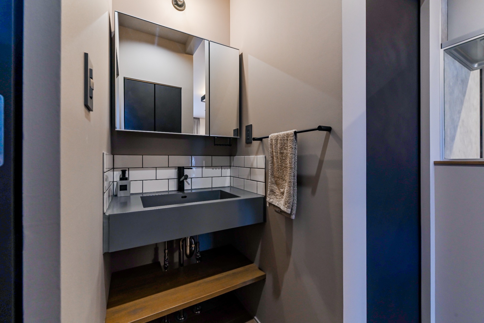 リッチ感漂うグロッシー仕上げのタイルにスチール鋼板の無機質な洗面台