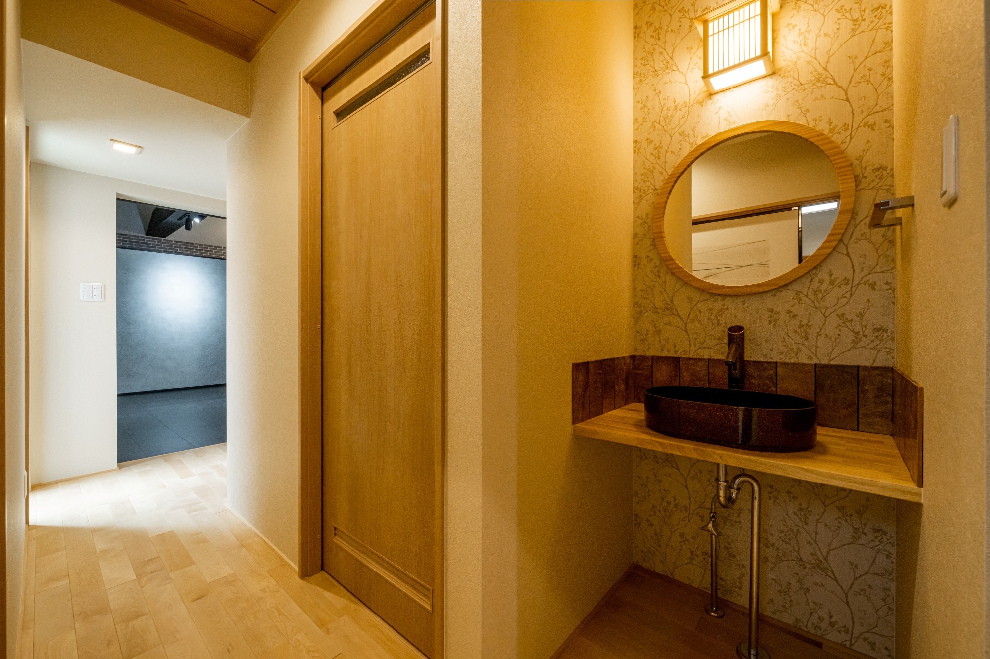 桶のような手洗器に和風照明と木枠付き丸鏡が似合う手洗いコーナー