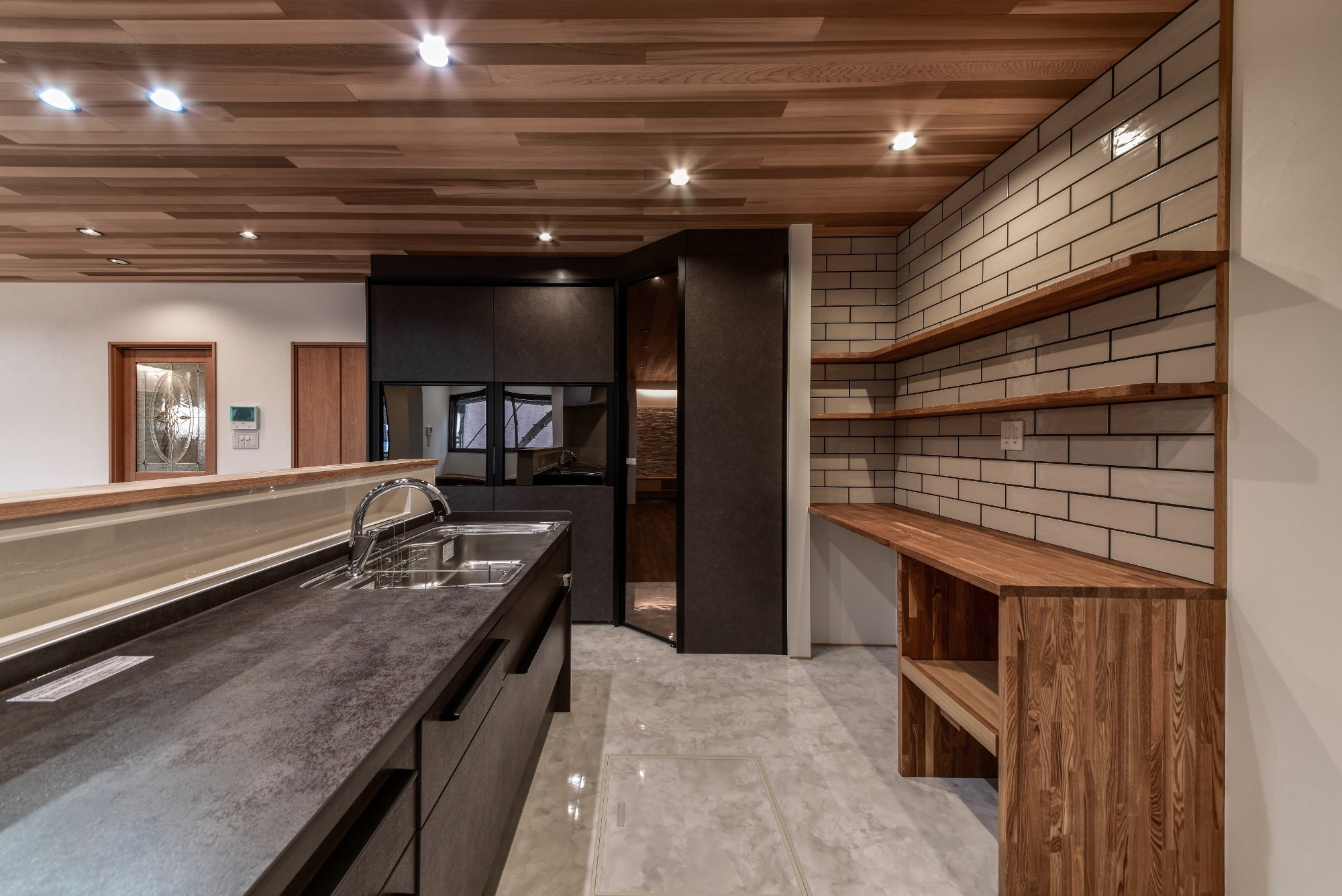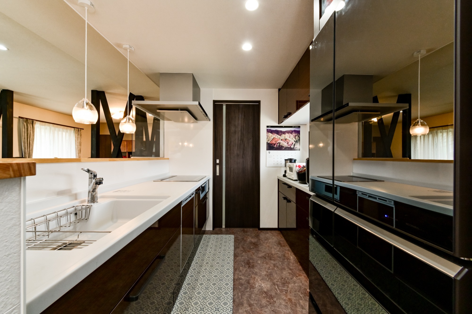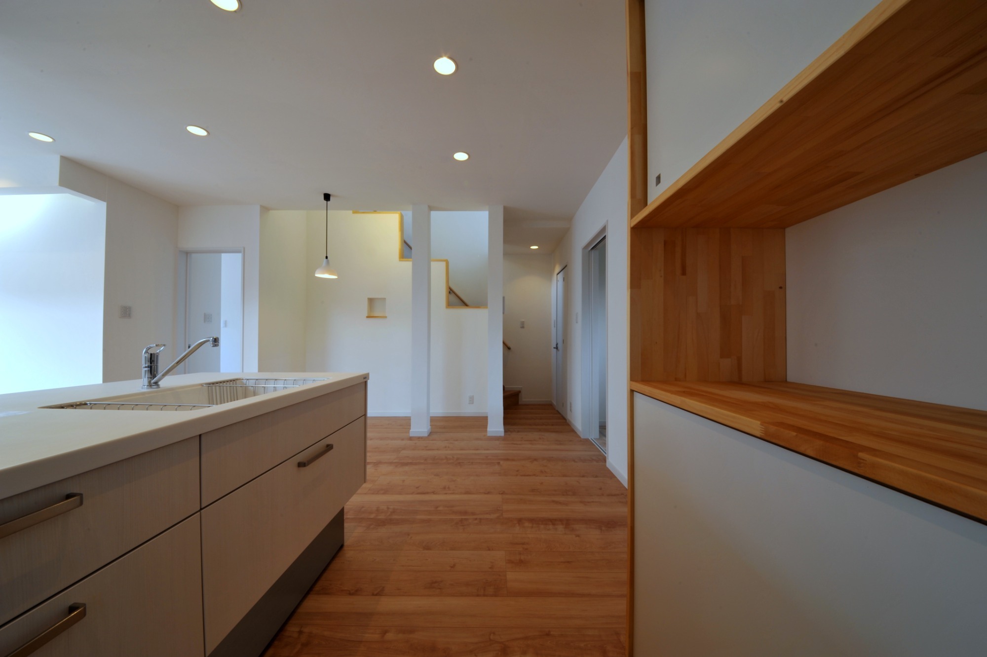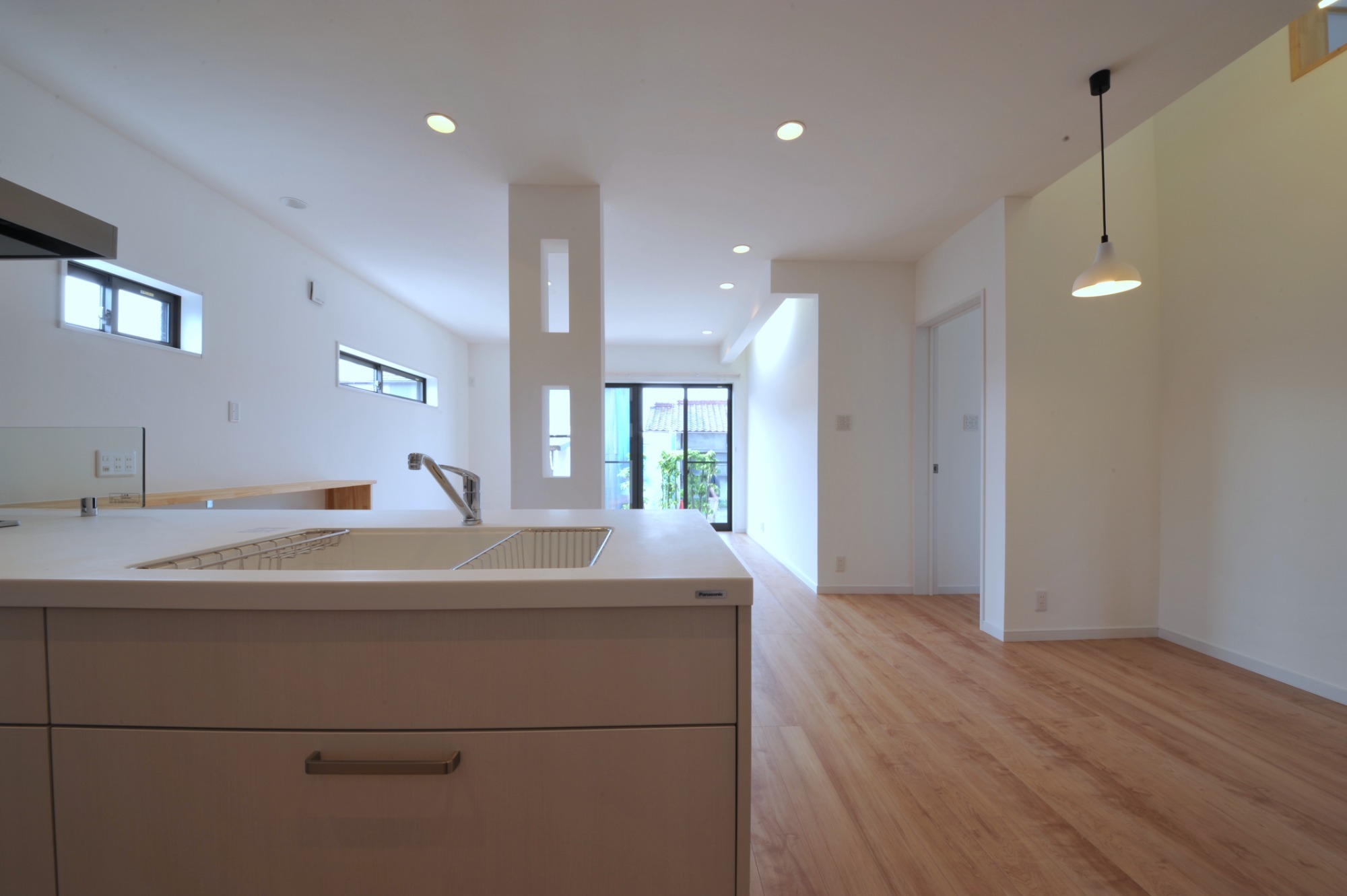 吊り戸棚のない対面キッチンで視線が抜ける開放感