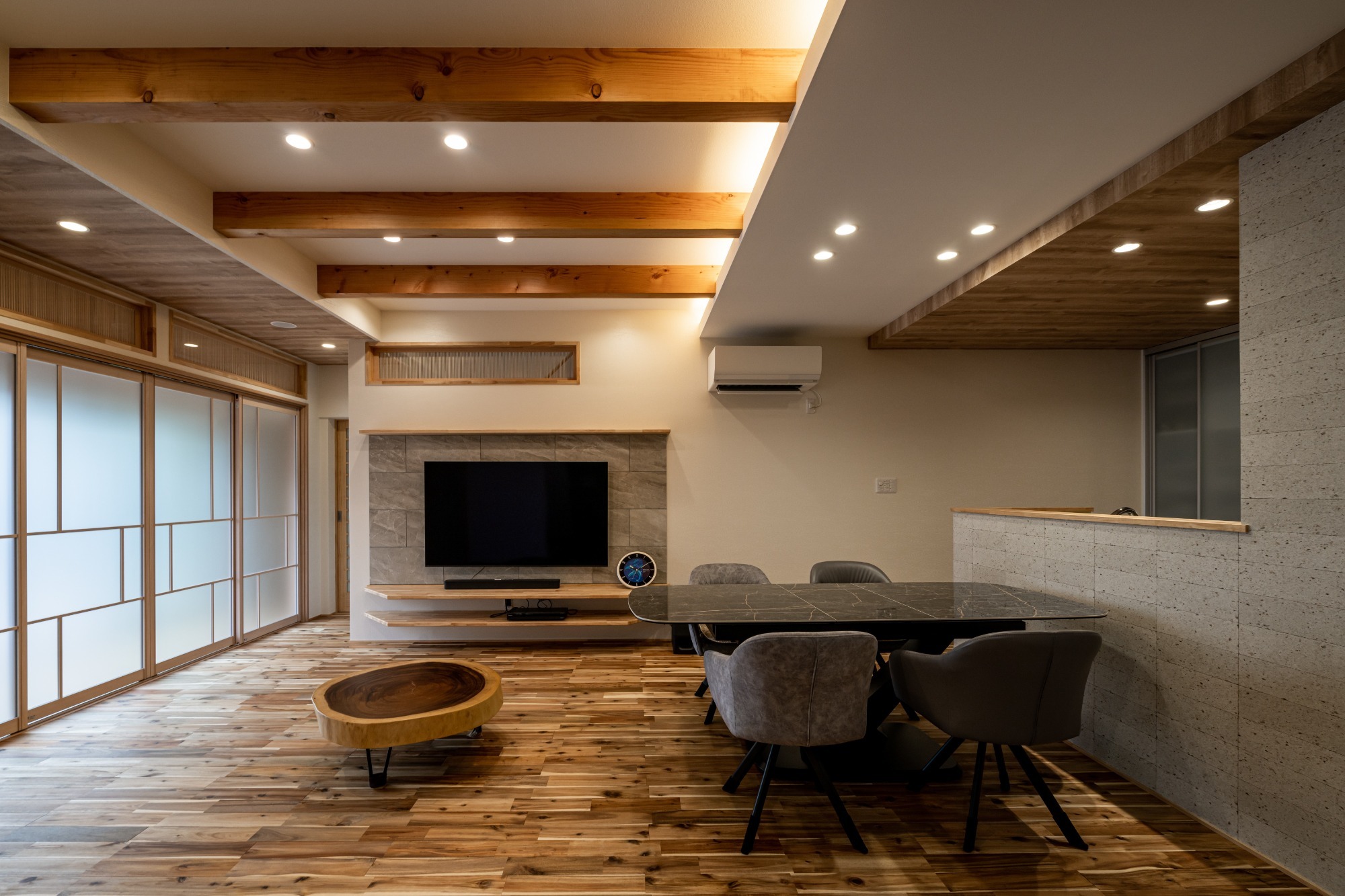 天井に段差をつけて間接照明に表し梁や欄間が映えるリビング