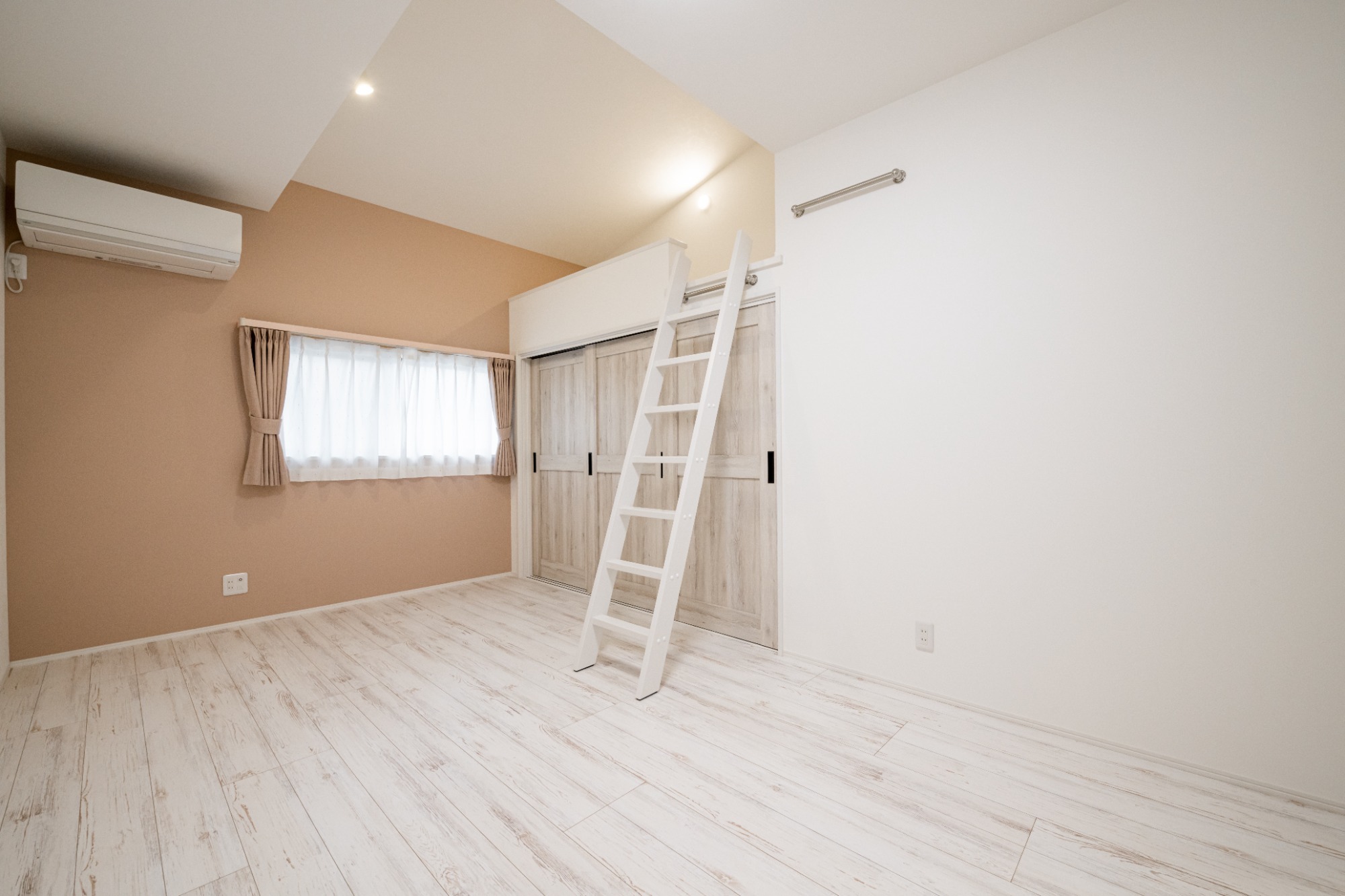 - 寝室には高い天井を活かしたデザインルーバーを設置