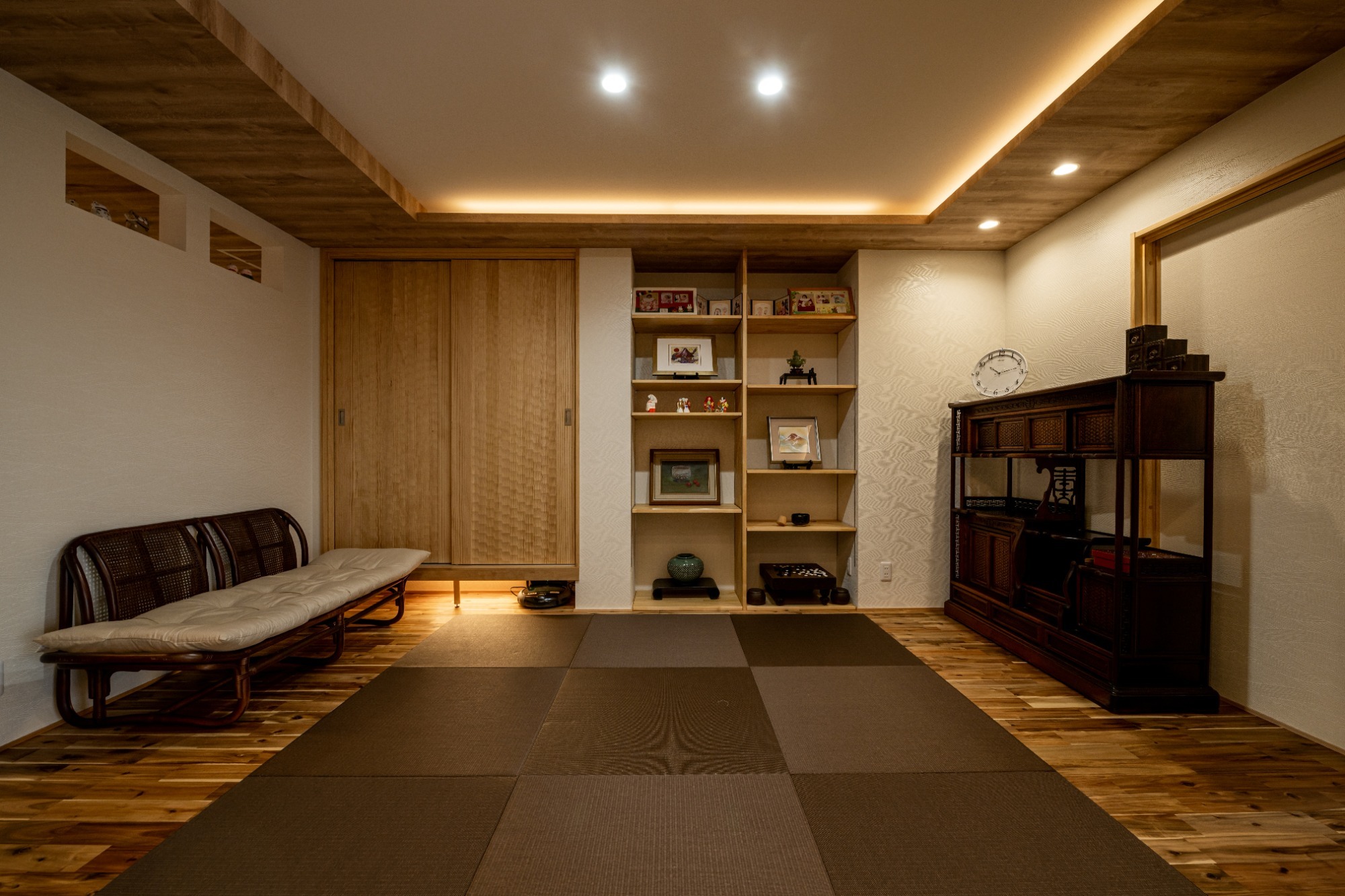 - 天井に段差をつけて間接照明に表し梁や欄間が映えるリビング