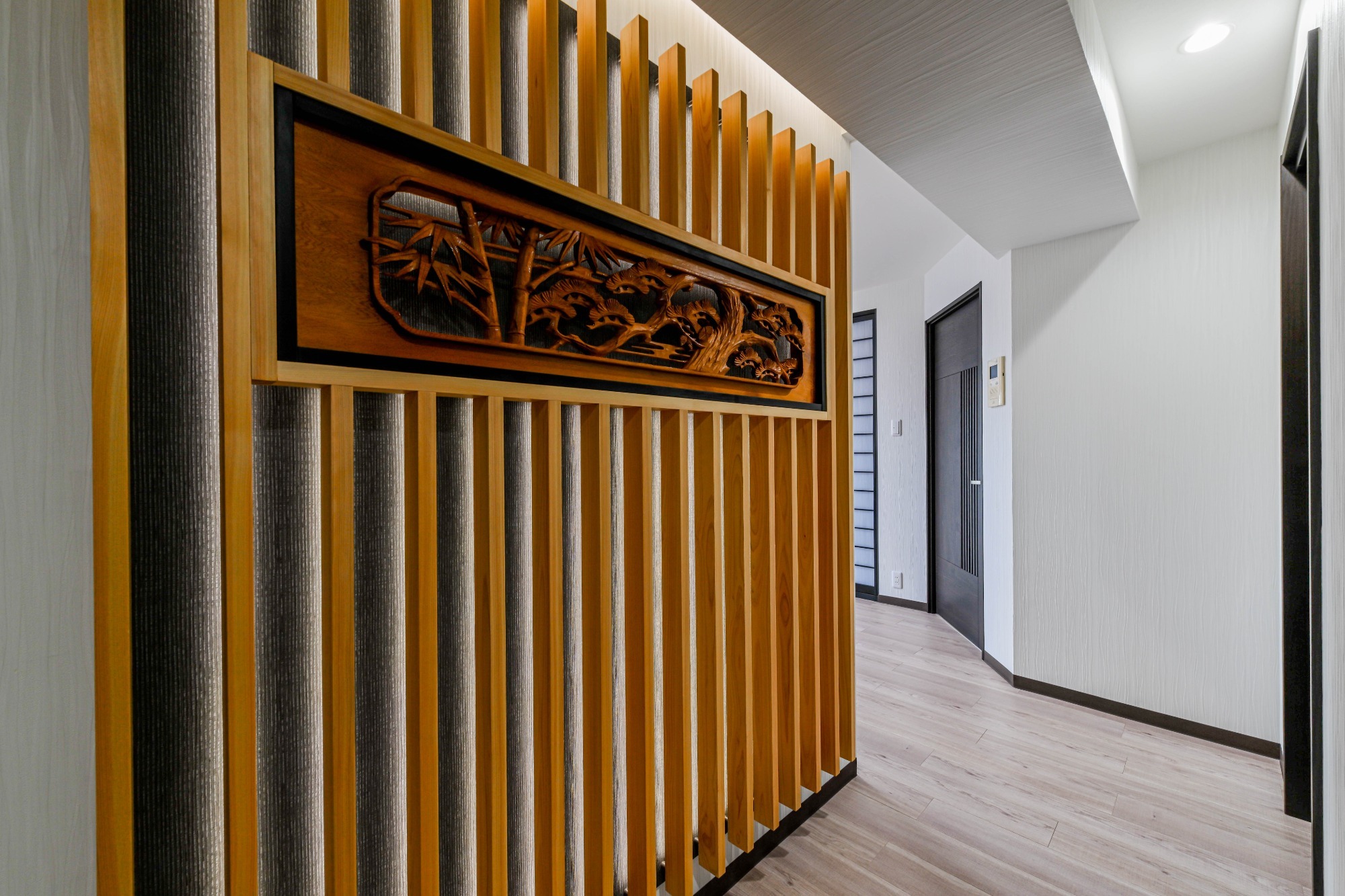 - 玄関ホールには格子に欄間をはめ込んでアクセント壁でお出迎え