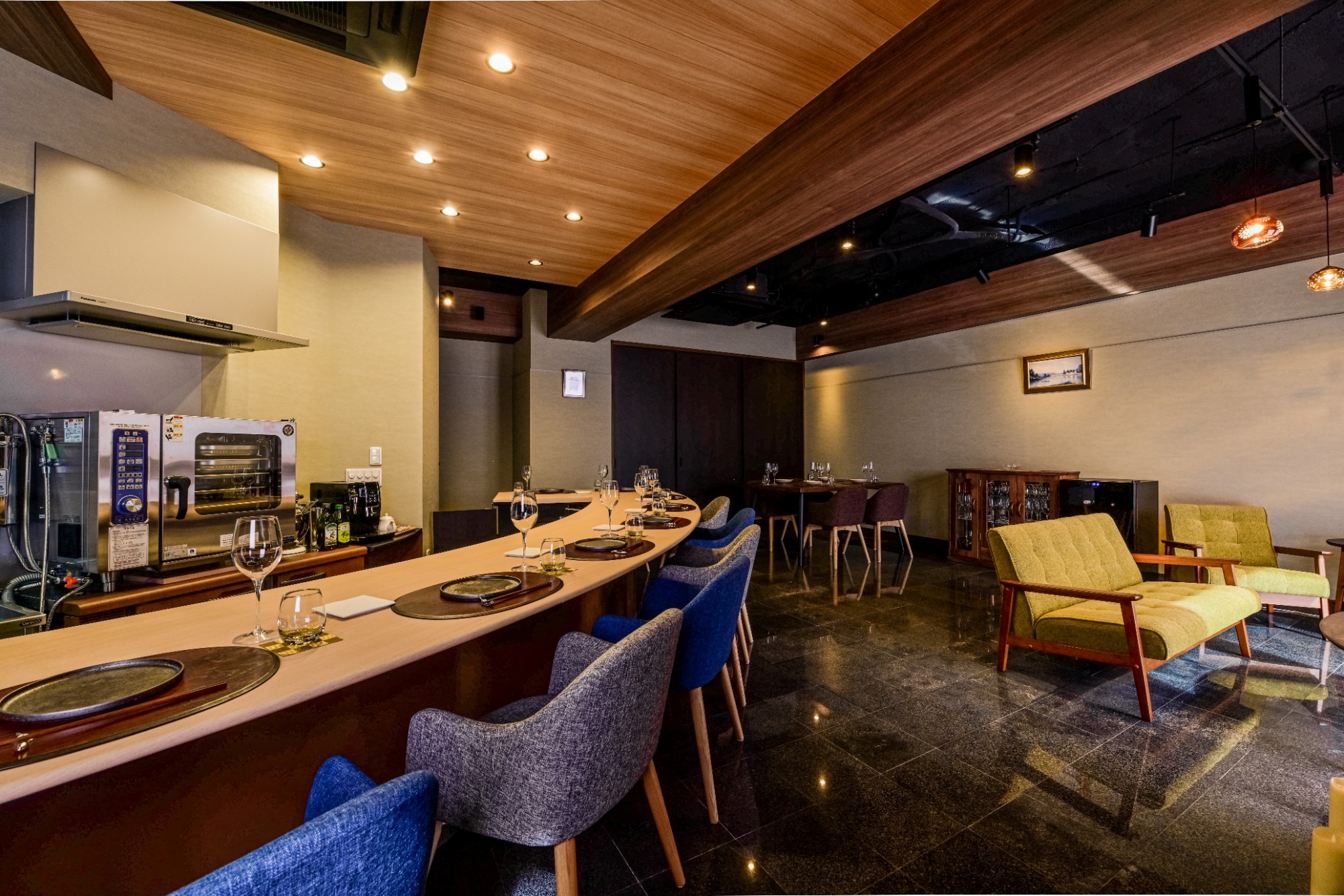 木目天井がやさしく包む、ぬくもりある店内空間