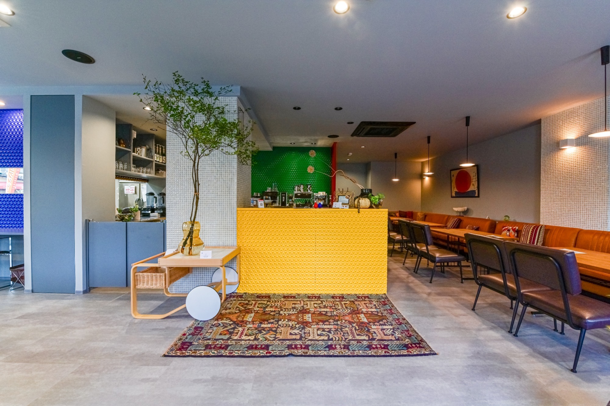 グレーに映える彩り豊かな癒しのカフェ空間