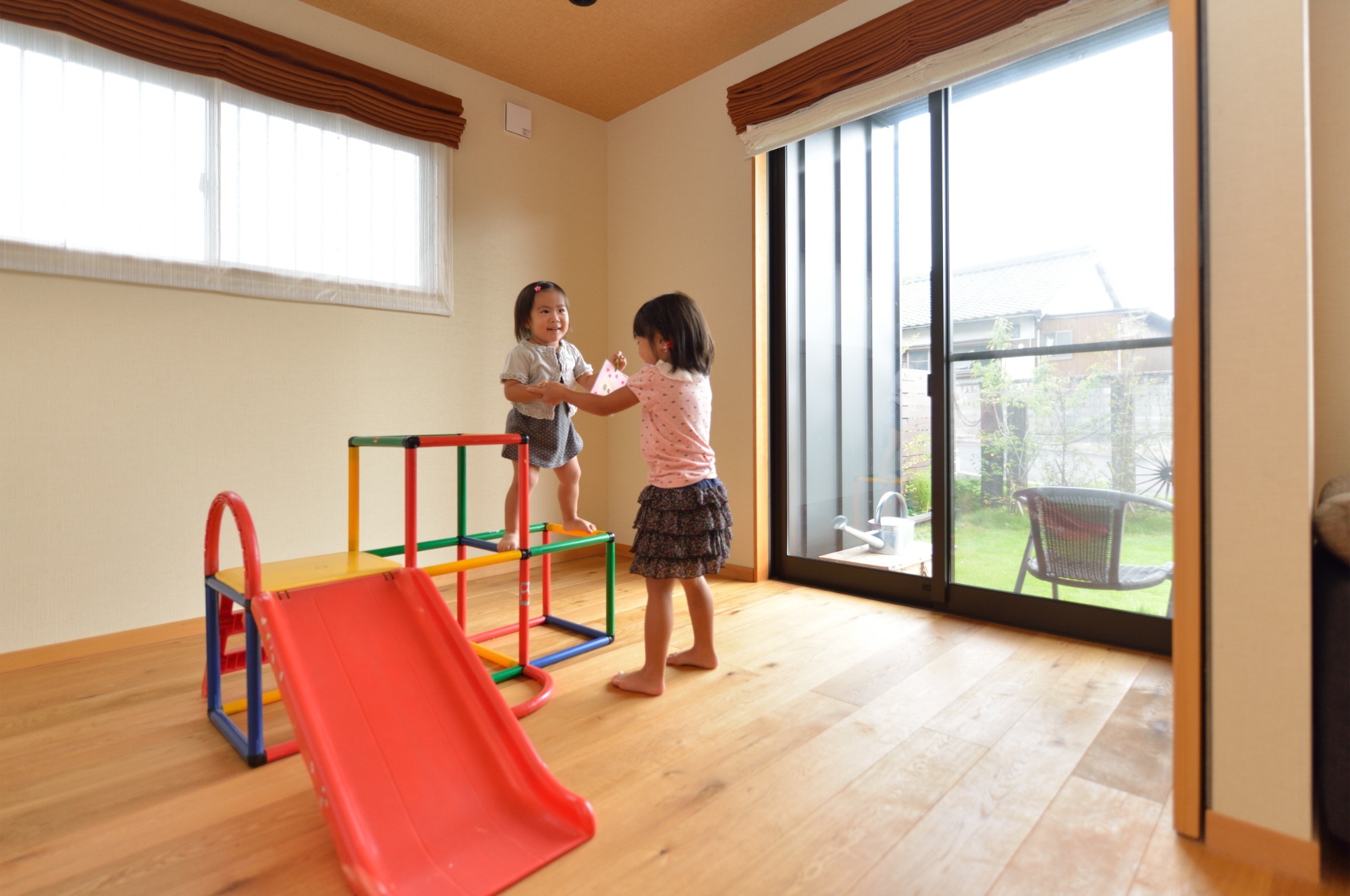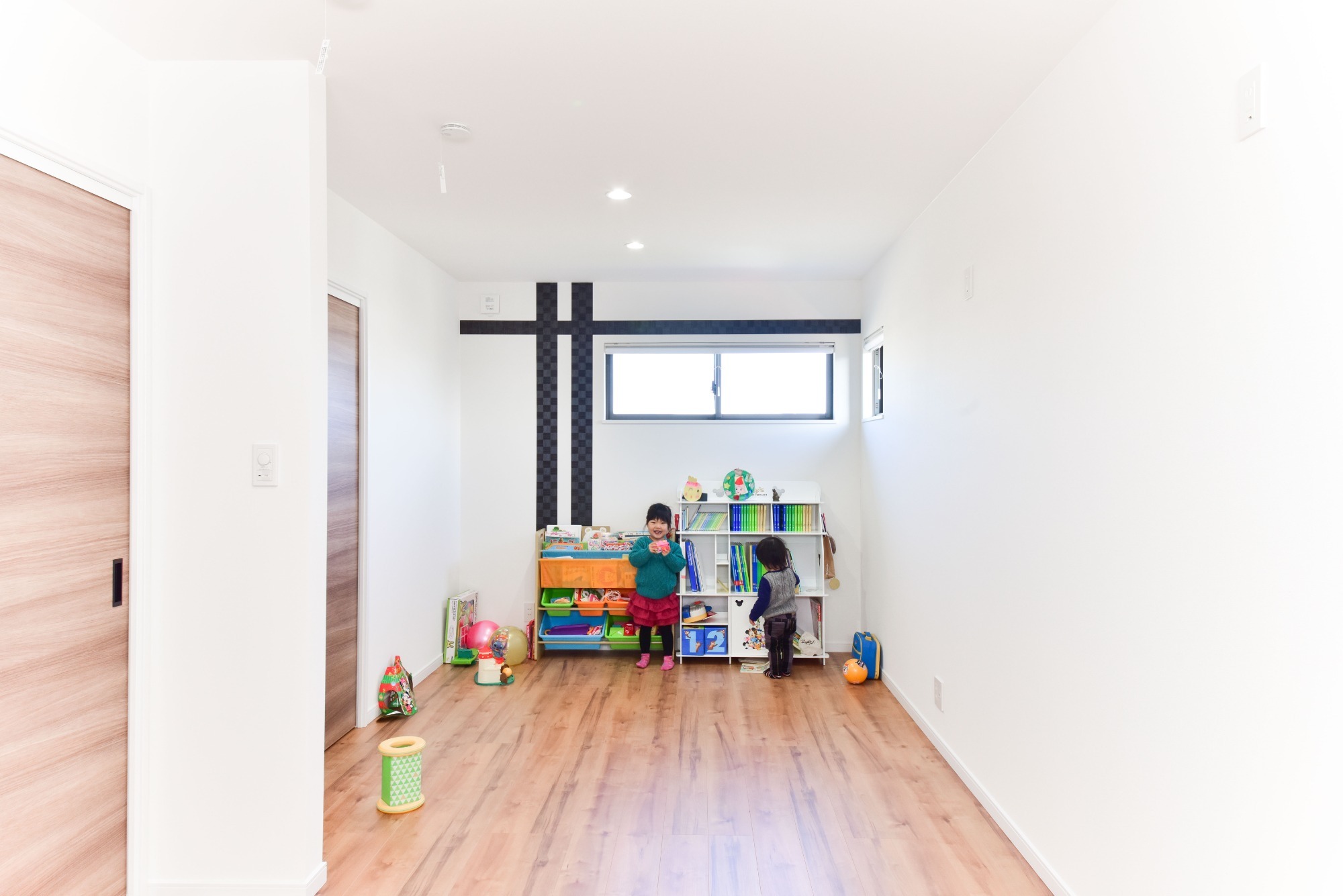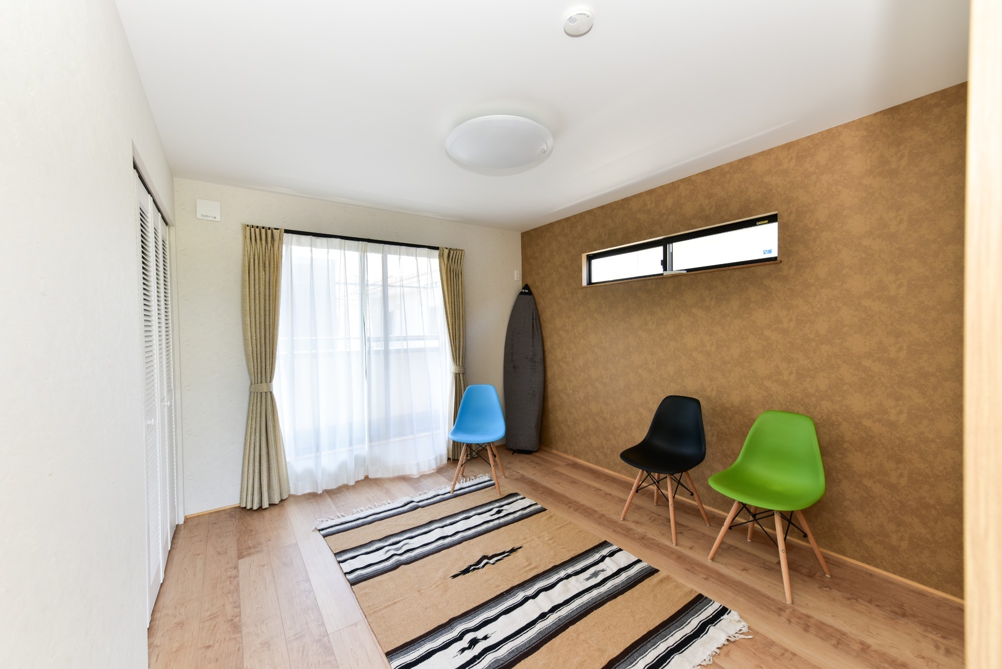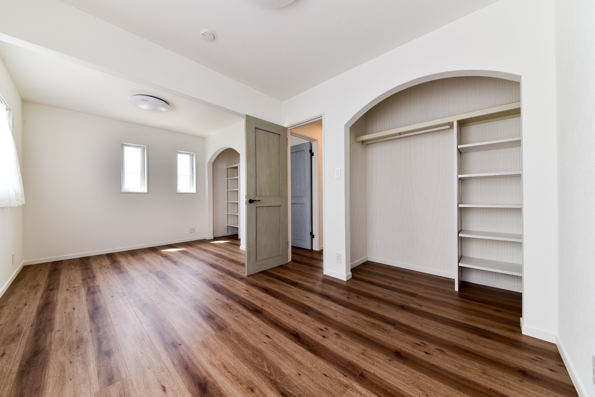 - 2階洋室はR壁でゆるやかに仕切り、見せる収納が空間のアクセントに
