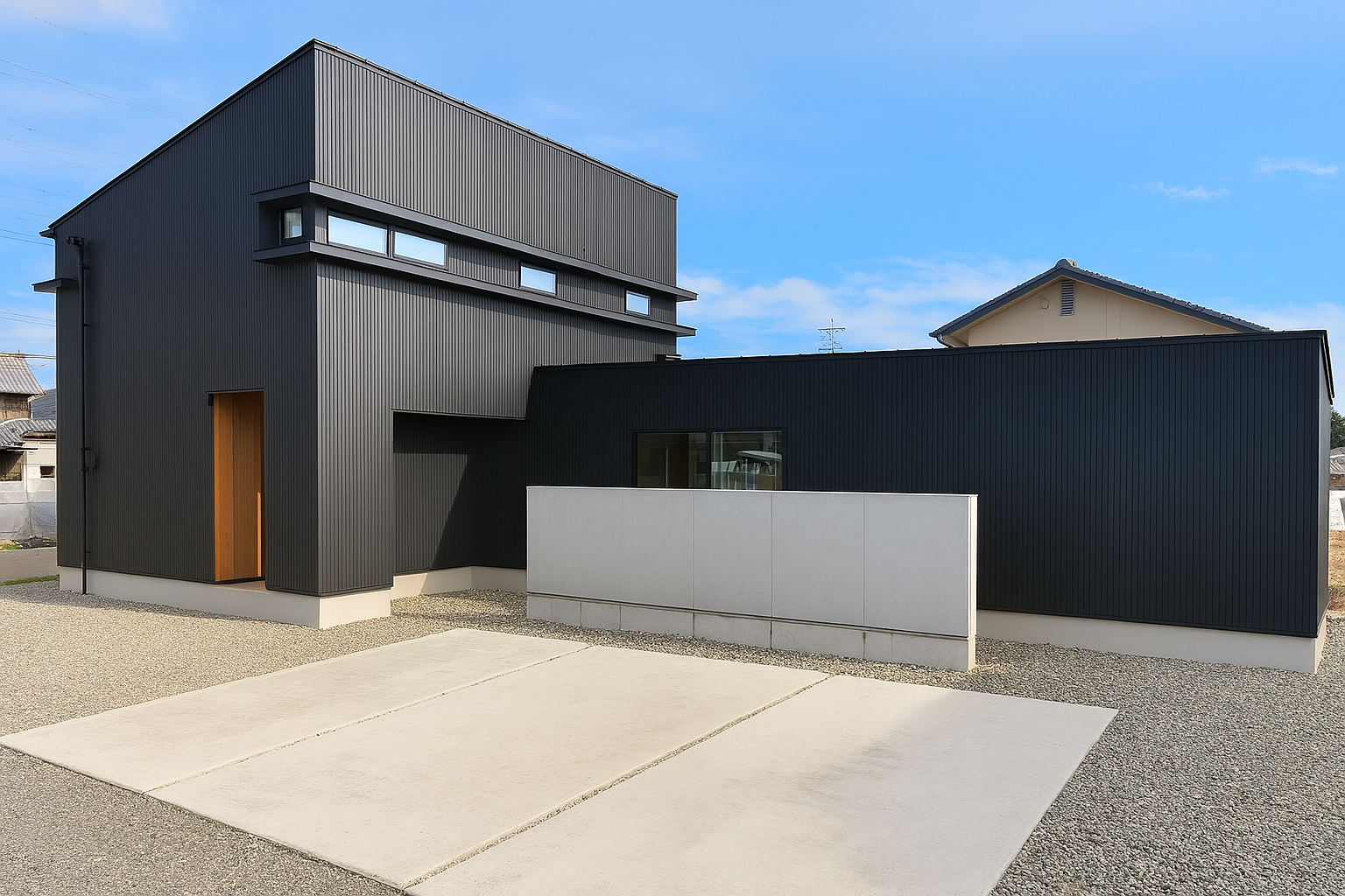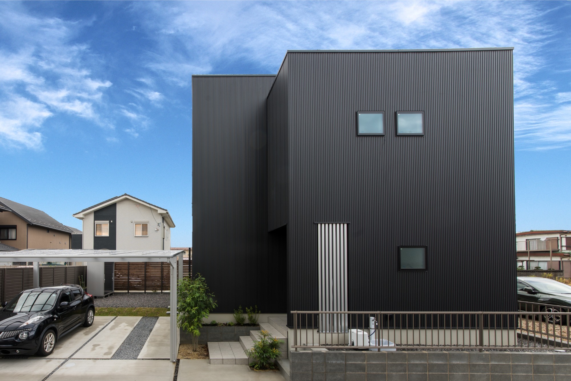 黒のガルバリウムが外観に重厚感と個性を演出
