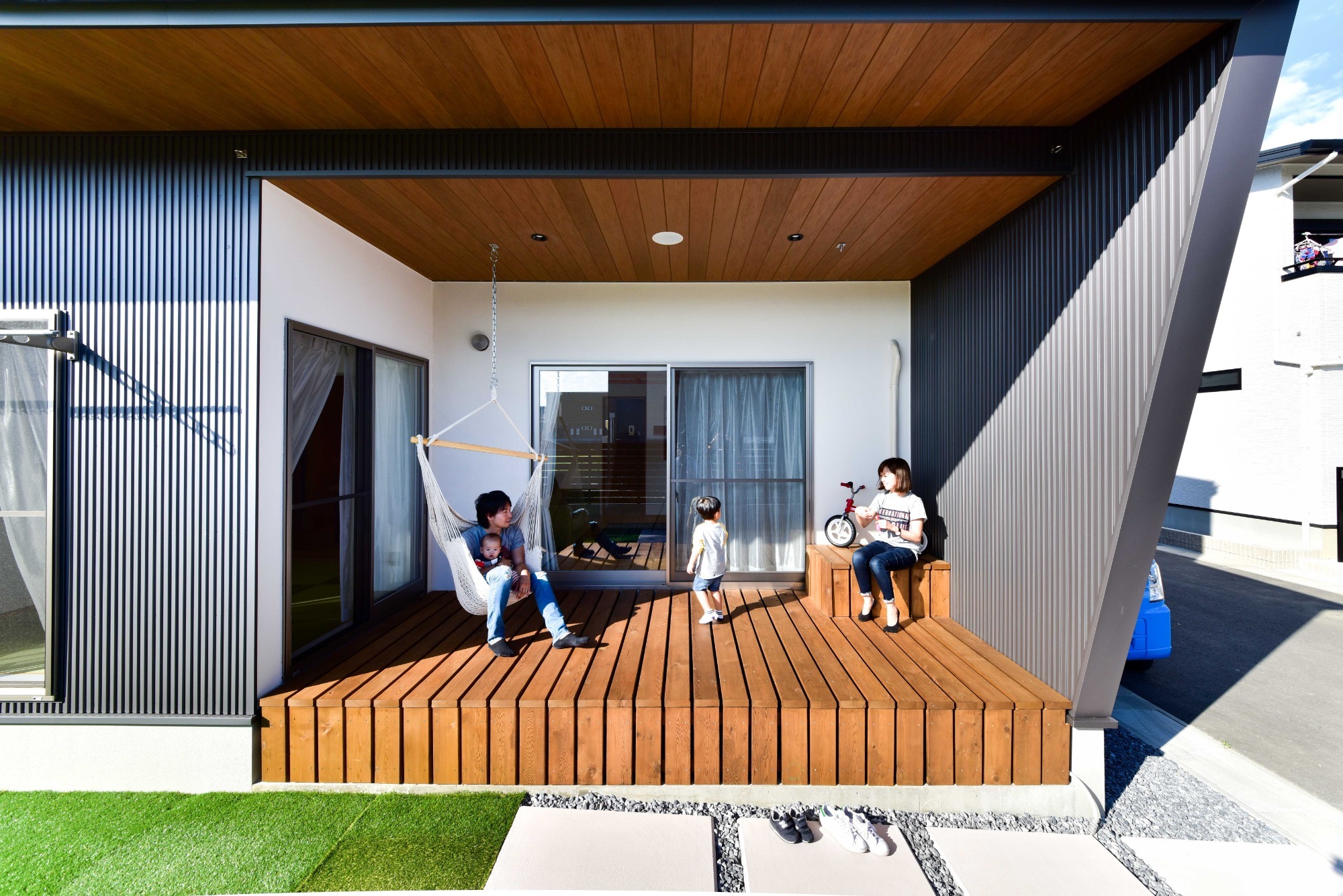 - 深い軒とウッドデッキにハンモックを設け、外と内がつながるくつろぎ空間に