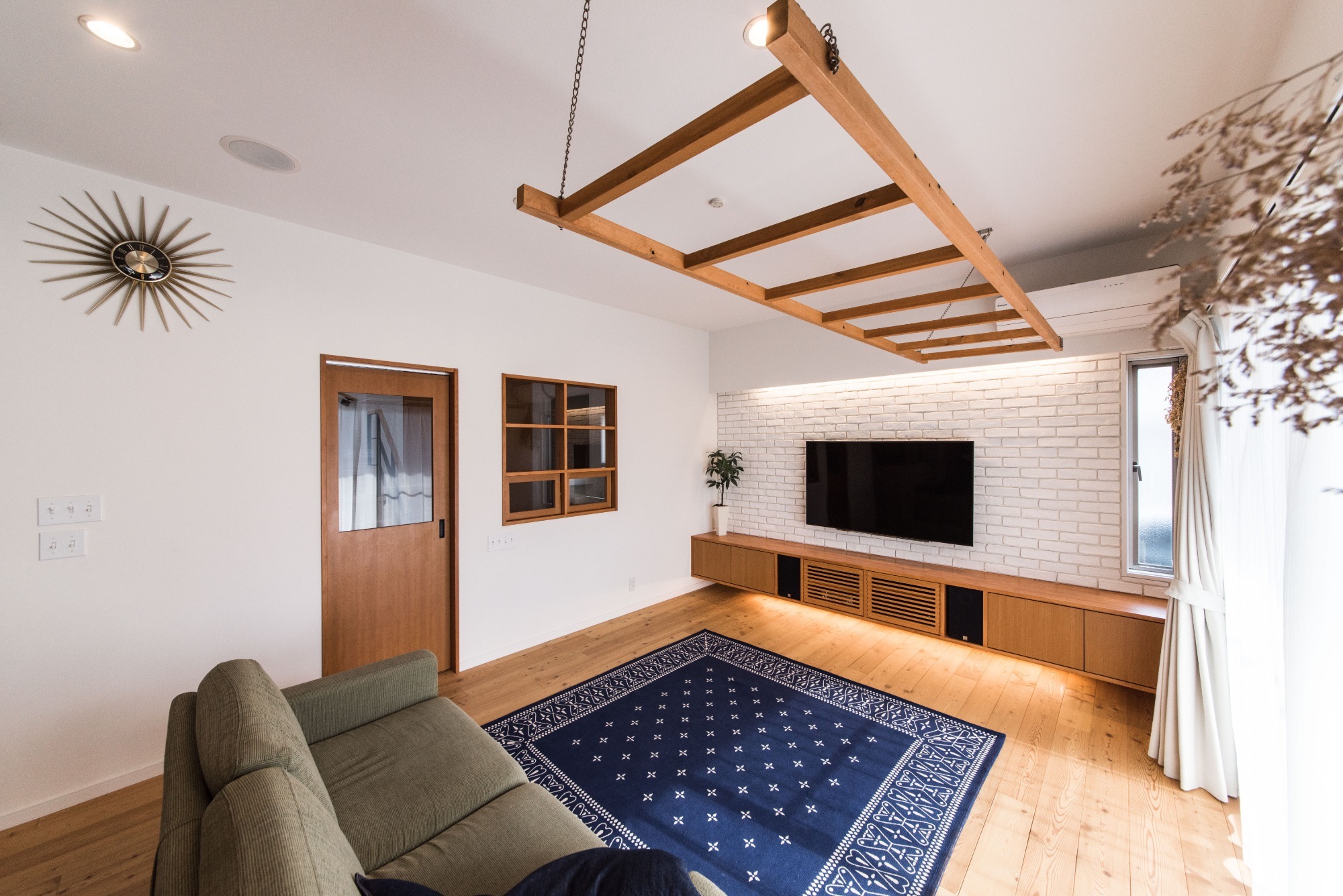 - タイル張りのアクセントと造作テレビボードが、落ち着きとこだわりを感じさせる