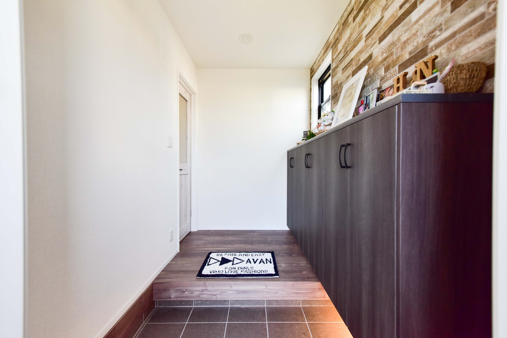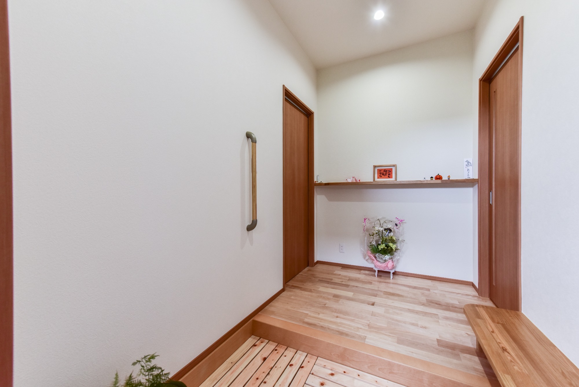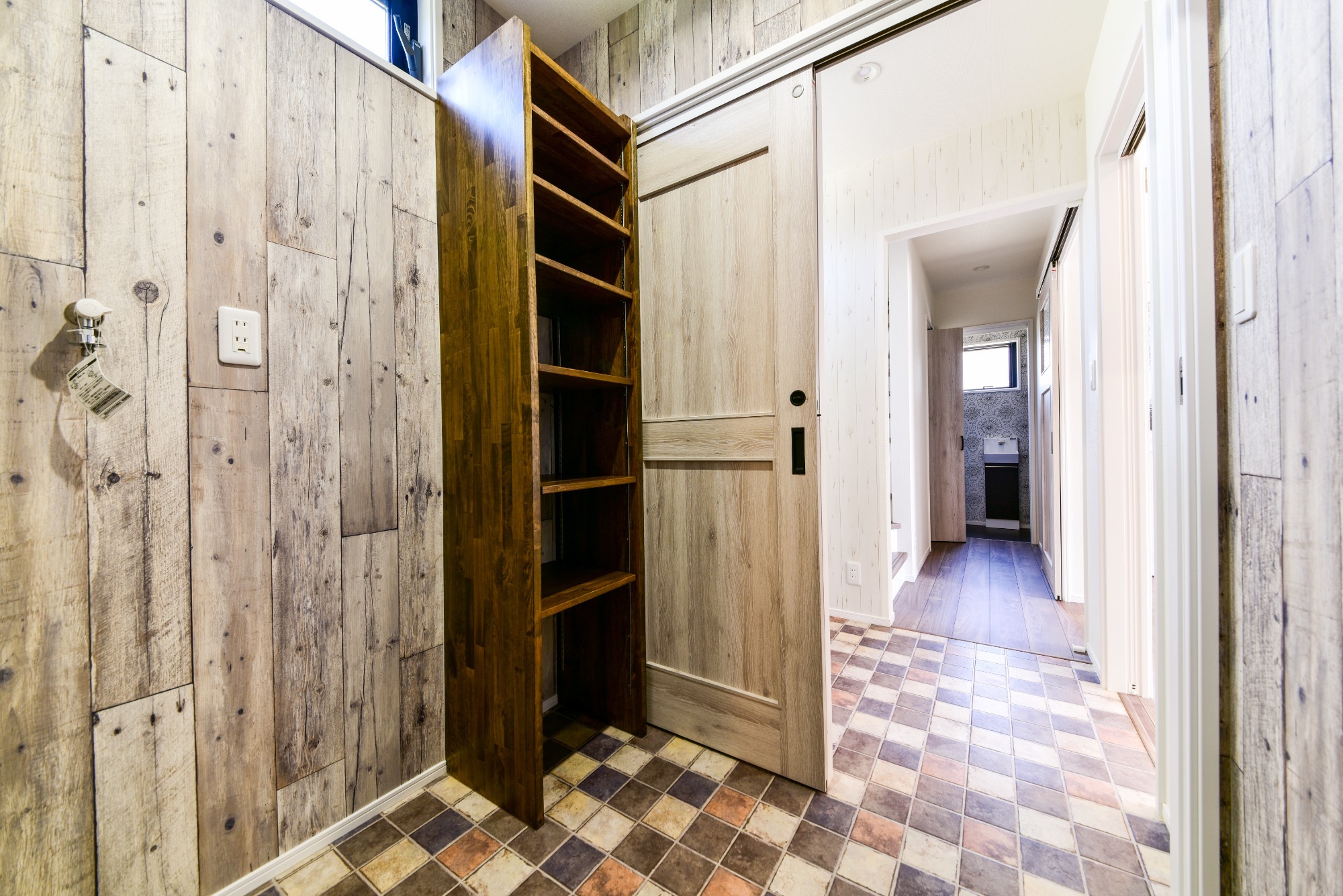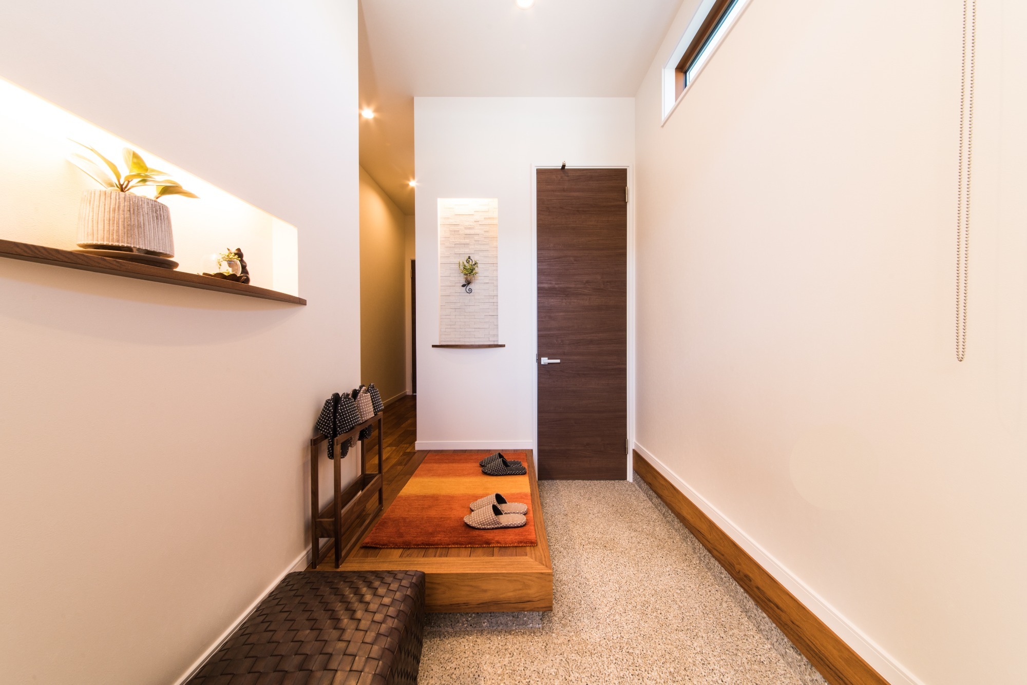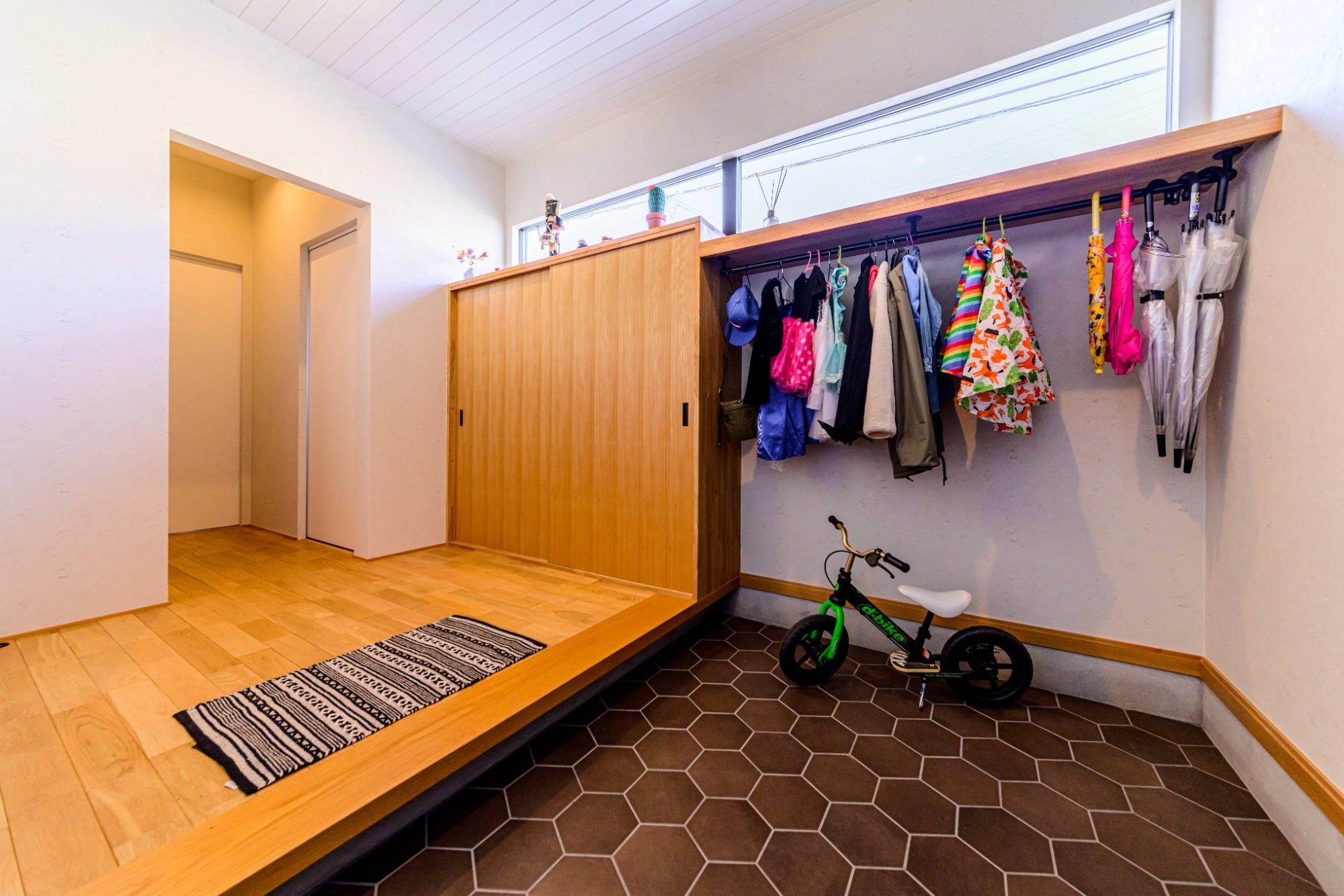 - 玄関にはタイルを貼り、素材の質感で迎えの空間を彩る