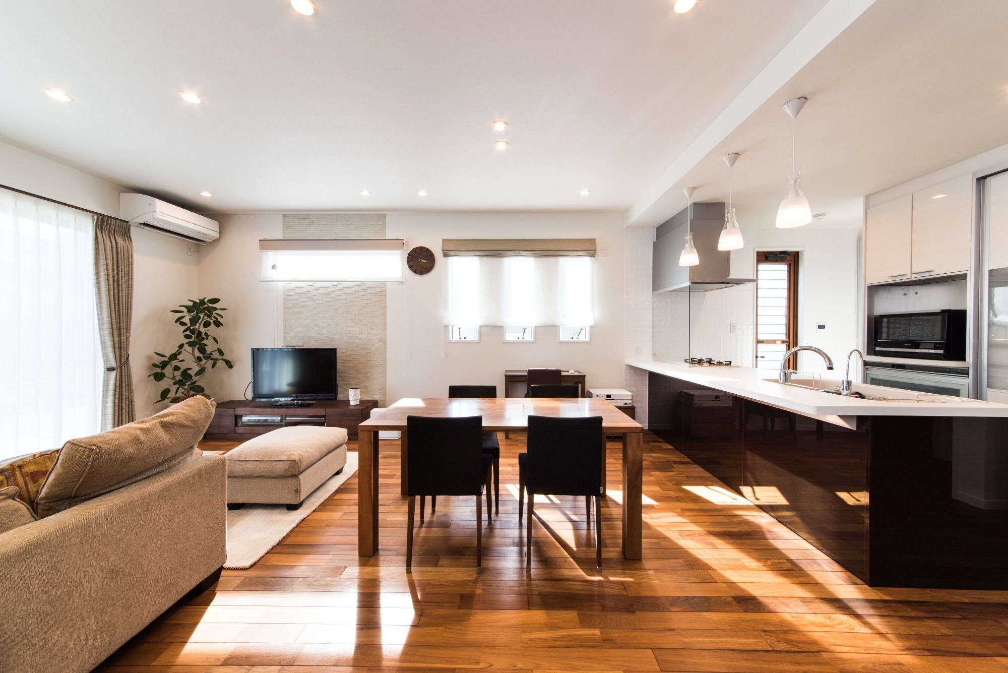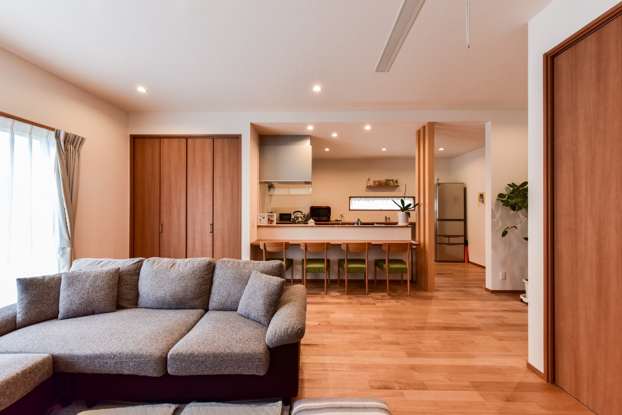 オークの無垢床が、足触りと木の温もりを感じさせる室内に