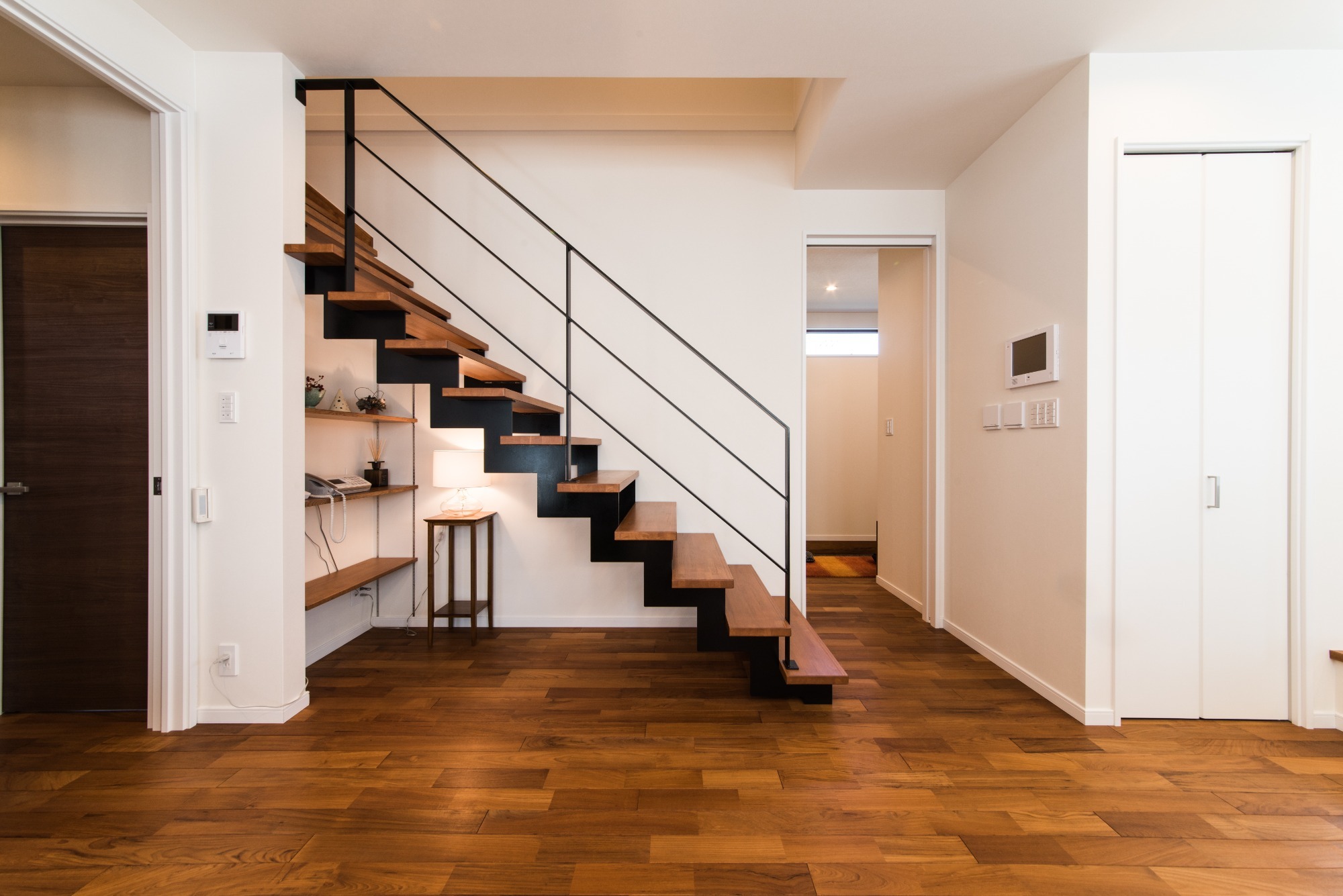 - 鉄骨階段が空間に軽やかさと力強さを添えるアクセントに
