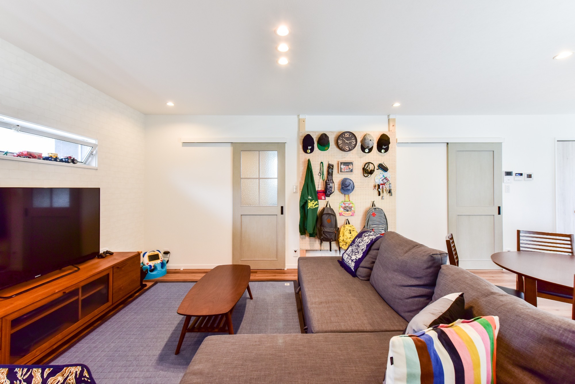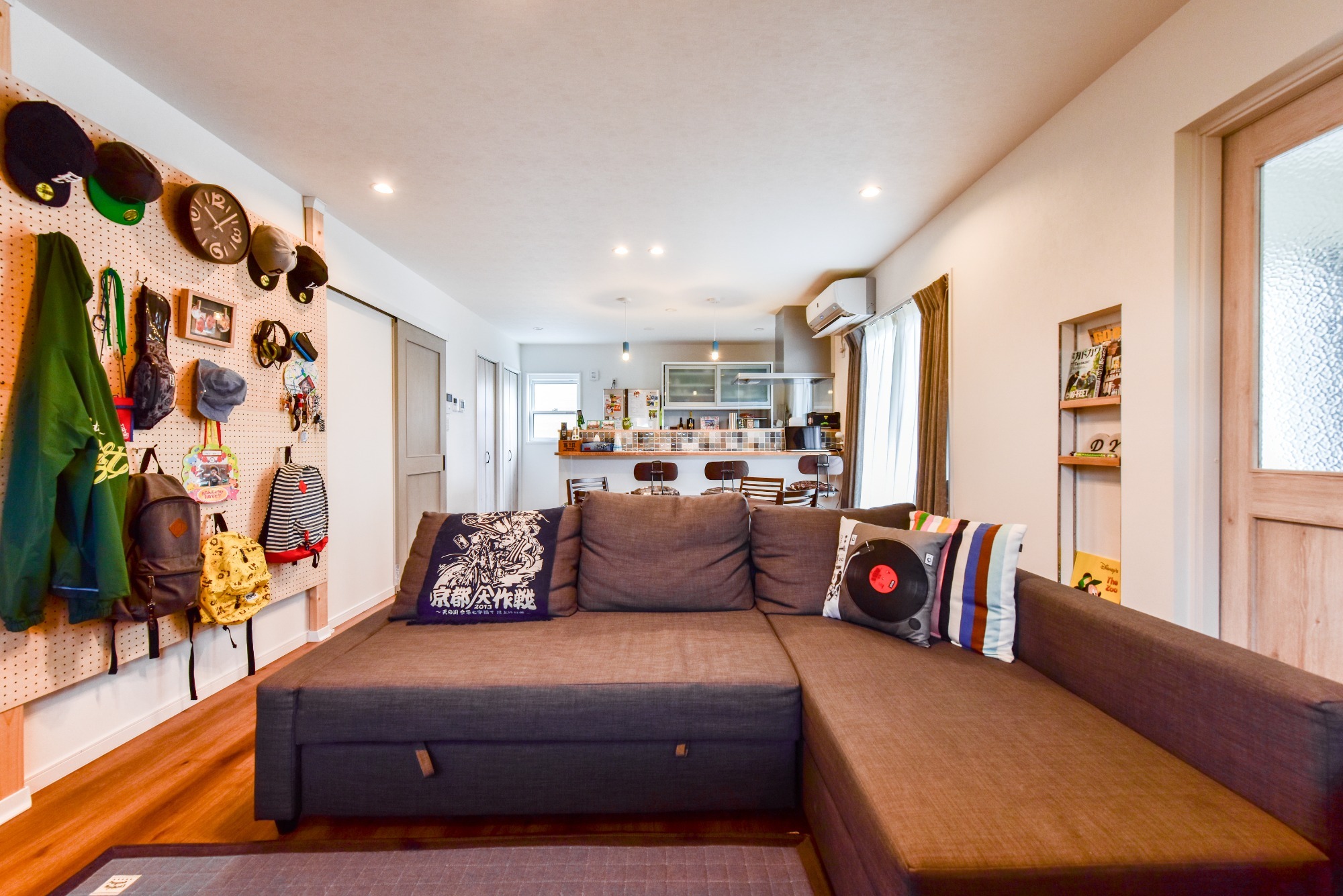 - 有孔ボードを活用した壁面が、収納とインテリアを両立