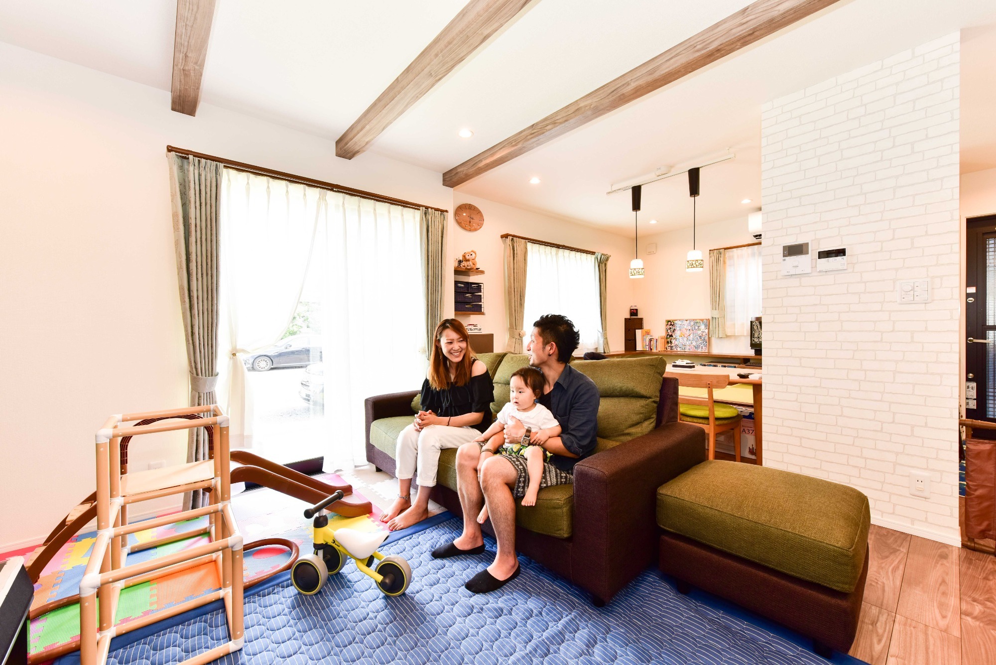 リビングには表し梁があり、木の力強さと温もりを感じる空間に
