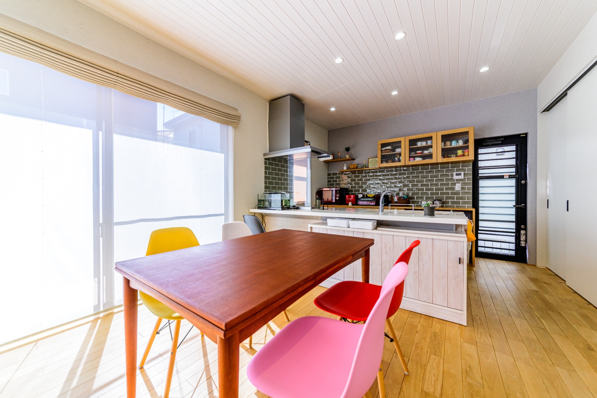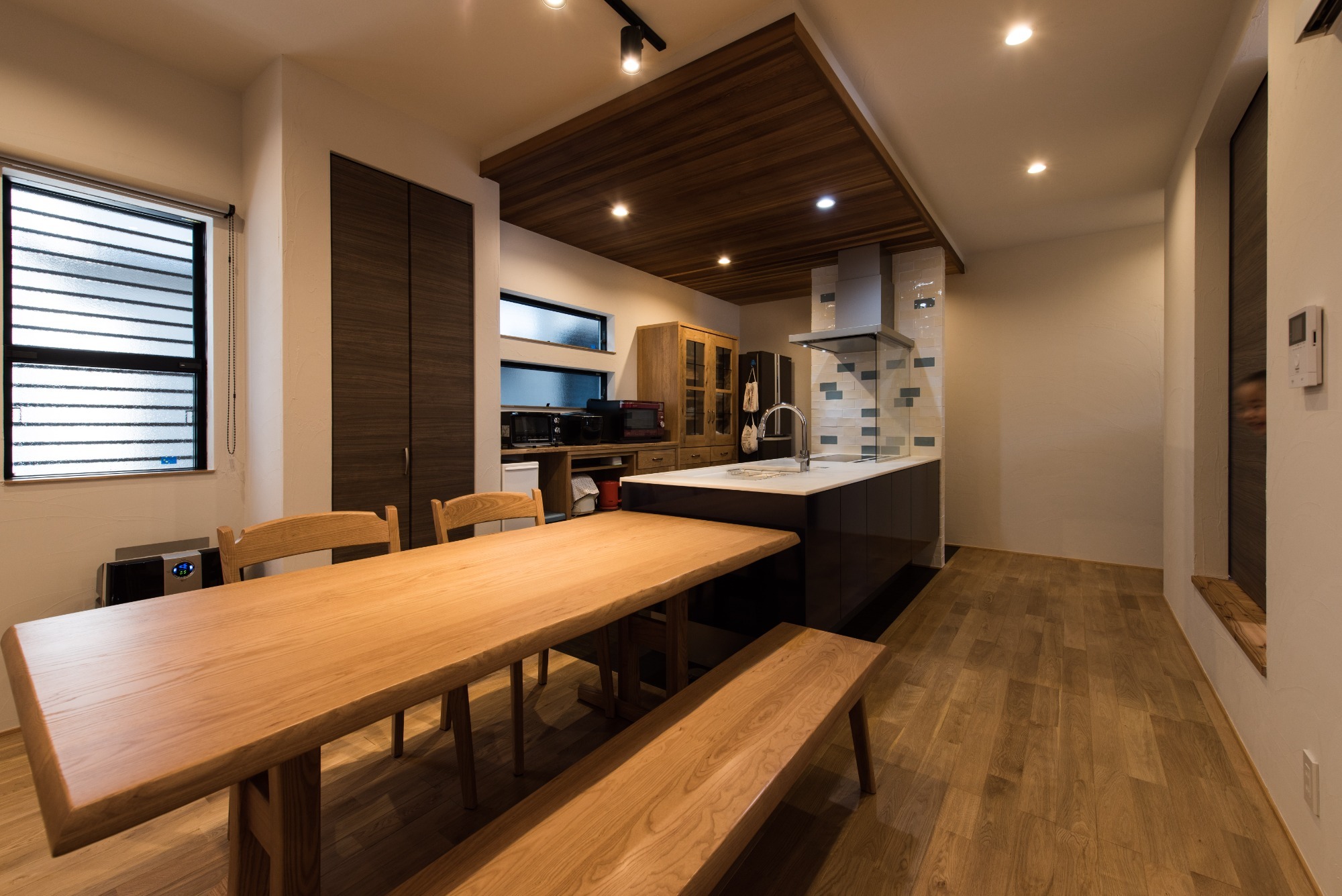 - 片側だけ1段上がったダイニングが、空間に変化と遊び心を