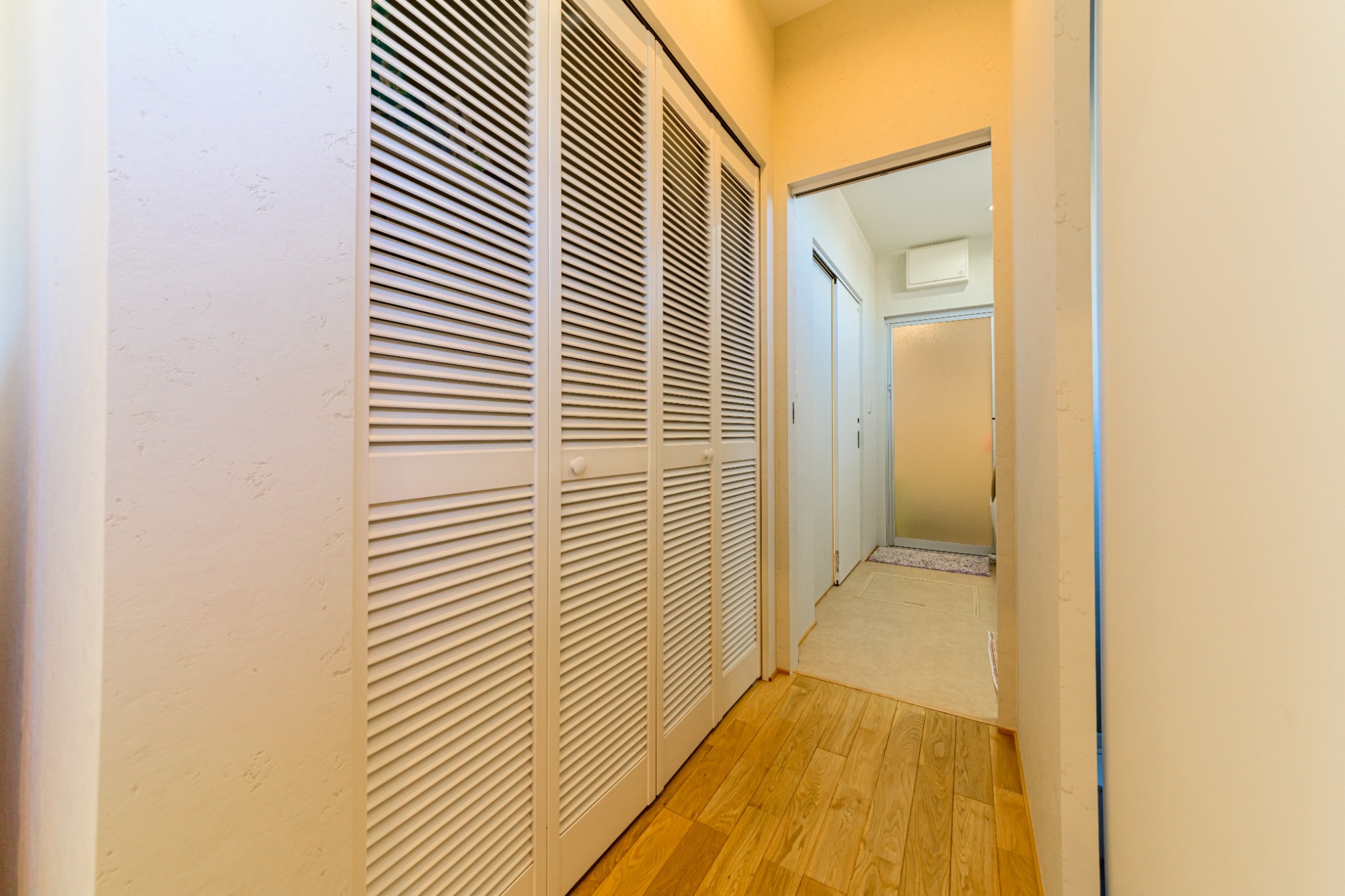 - 通気性のあるルーバー扉の収納が、見た目と機能を両立