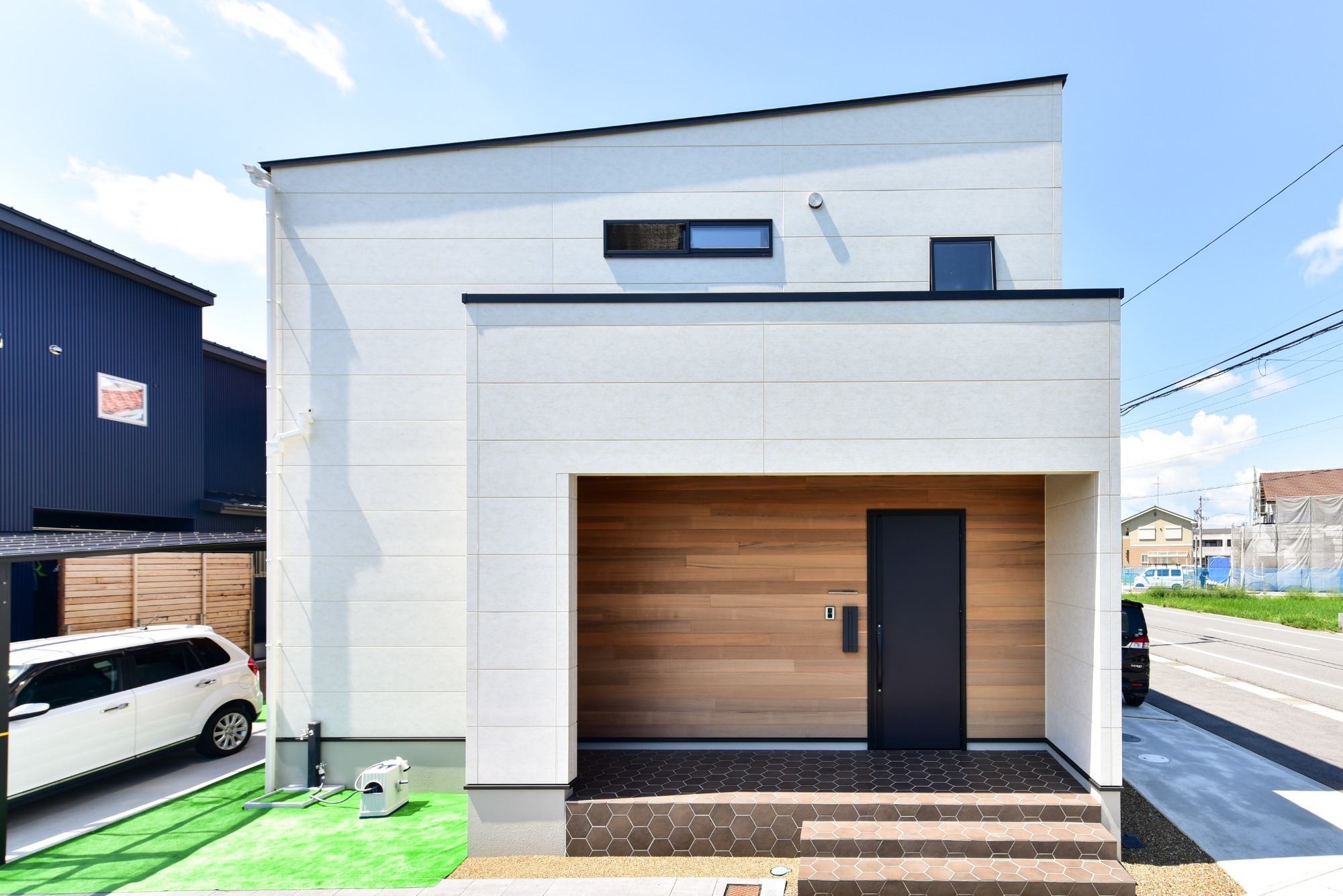 白い外壁と片流れ屋根が、すっきりとした印象の外観に