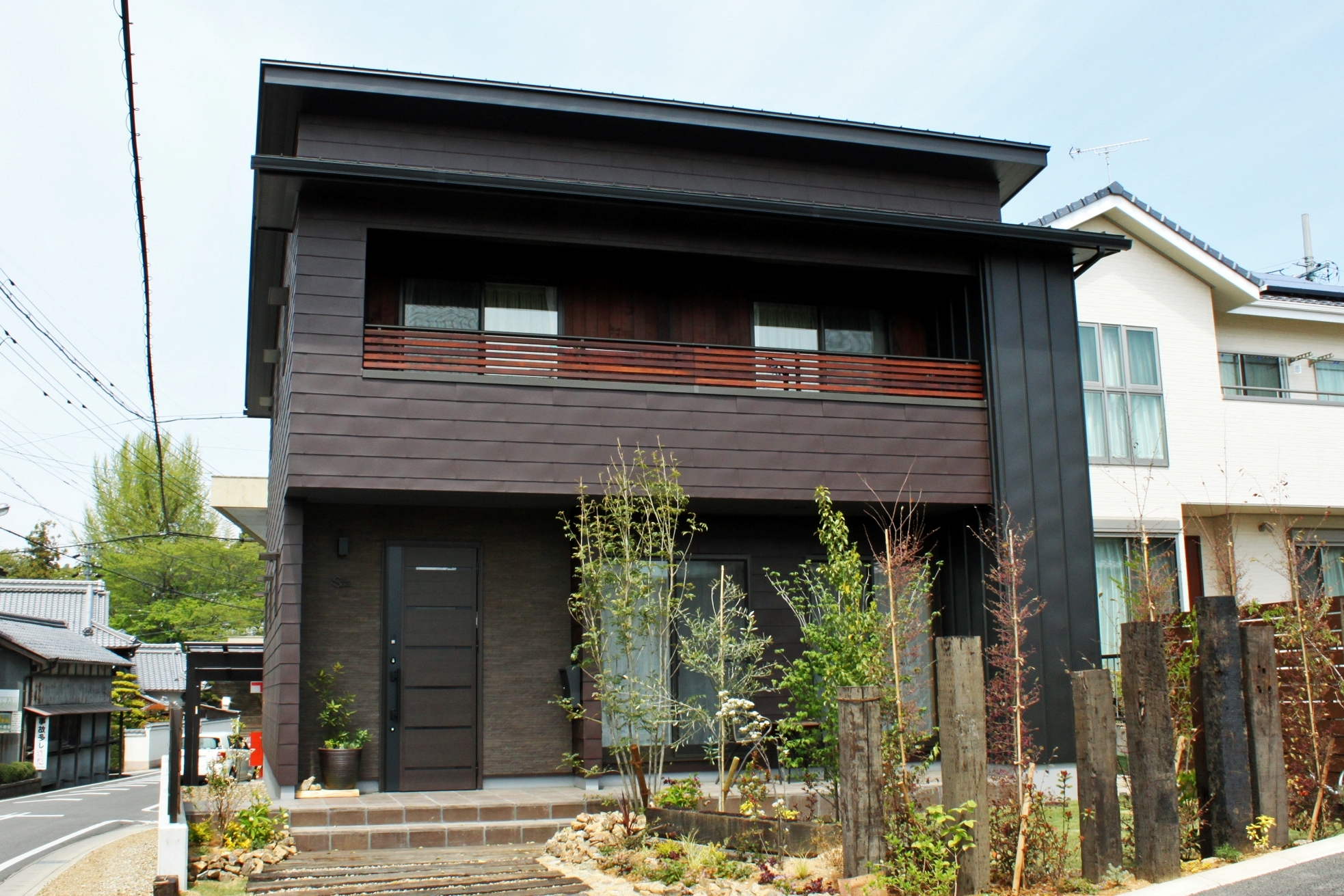 黒と茶色のガルバリウム鋼板が、外観に重厚感と個性を演出