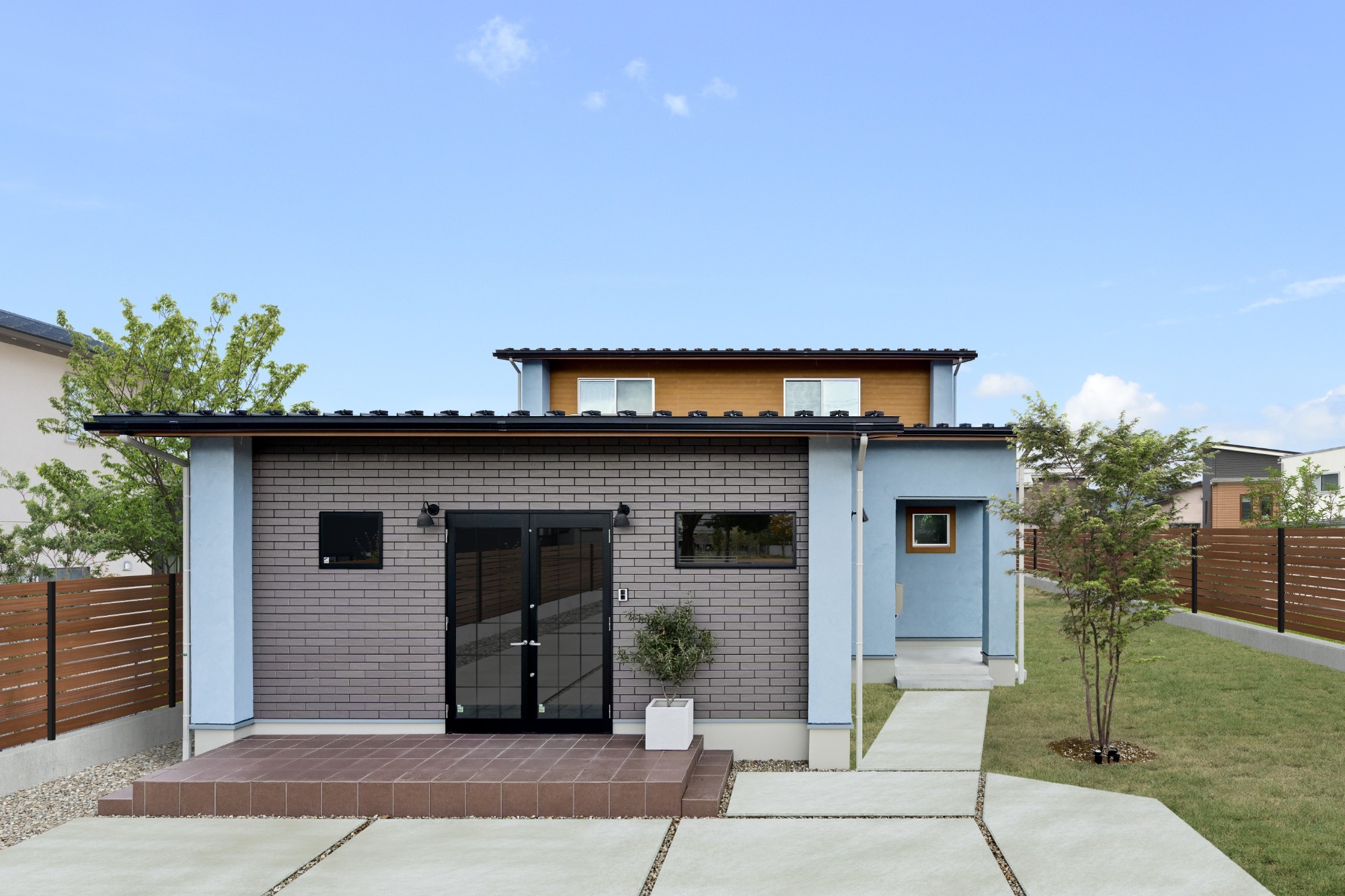 水色とグレイッシュカラーのタイルはオシャレで人目を引く外観
