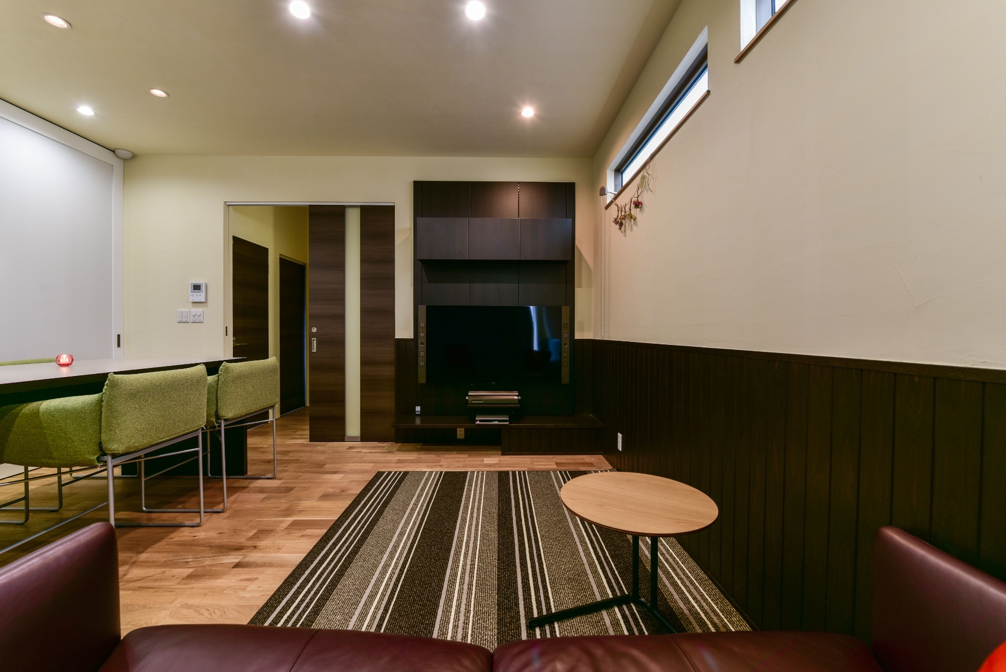 深みのある壁色に個々のソファーが映える居心地いいリビング