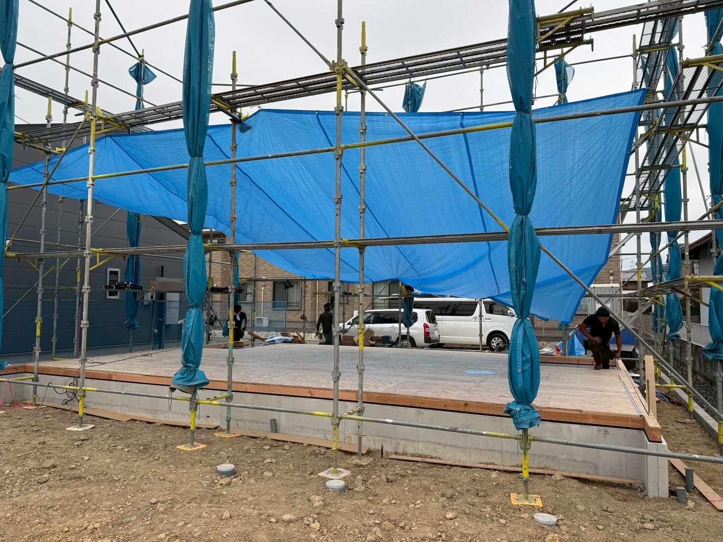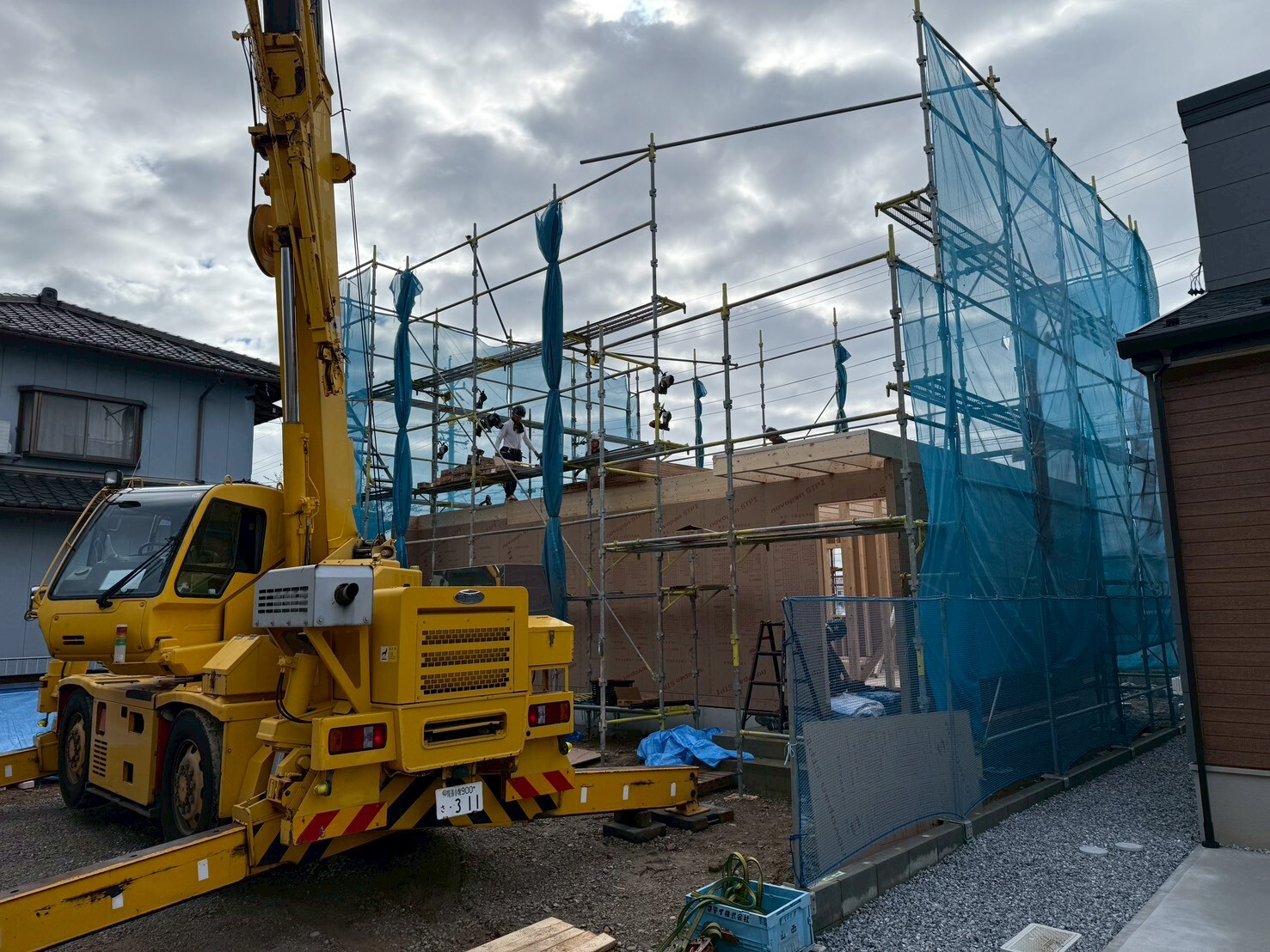 あいにくの曇り空、時折小雨も降る中ではありましたが、無事に土台伏せから上棟までを終えることができました。